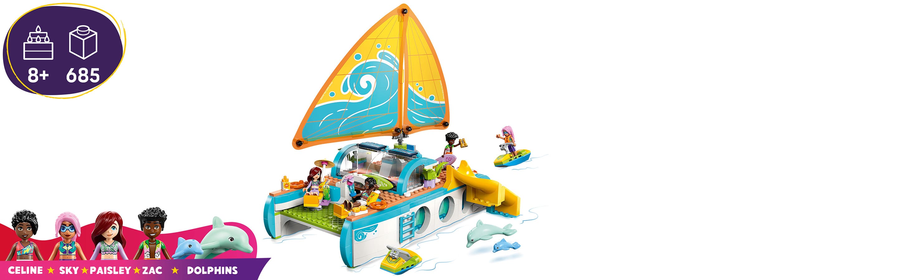 Набір містить 4 мініляльки та 2 дельфінів для сюжетних ігор із персонажами, які відпочивають на човні та спостерігають за морською фауною.