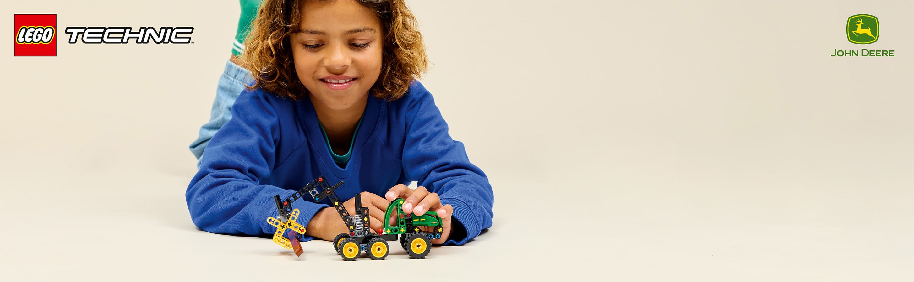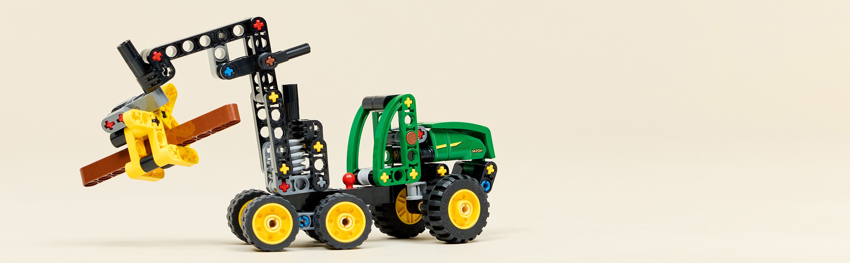 Колісний комбайн John Deere 1470H з поворотною стрілою й робочим захватним пристроєм надихає дітей створювати власні історії під час гри.