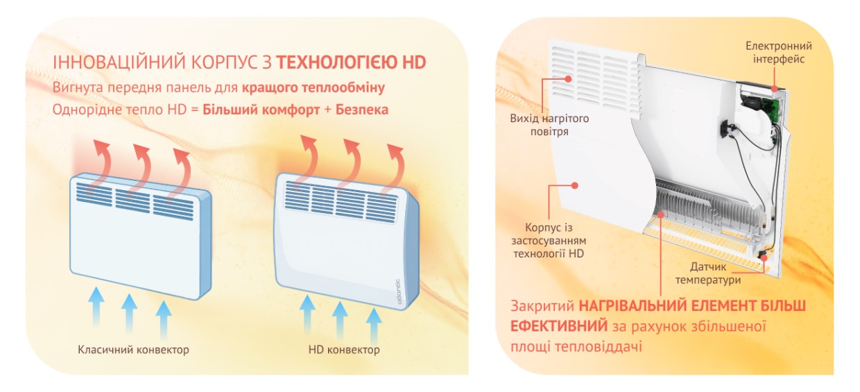 Технологія HD (High Density), що лежить в основі серії, забезпечує посилену тепловіддачу завдяки спеціальній конструкції корпусу та продуманій системі циркуляції повітря. Лицьова панель швидко прогрівається і м'яко віддає тепло у приміщення, створюючи комфортний мікроклімат без пересушування повітря та запаху розжареного металу. Тепло передається шляхом поєднання природної конвекції та м'якого інфрачервоного випромінювання, забезпечуючи ефективний розподіл навіть за невисокої потужності.