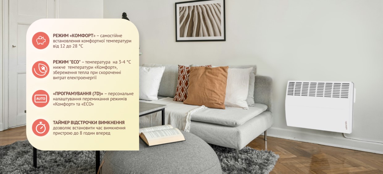 Конвектори Atlantic F125 оснащені електронним термостатом високої точності та підтримують гнучке керування режимами: