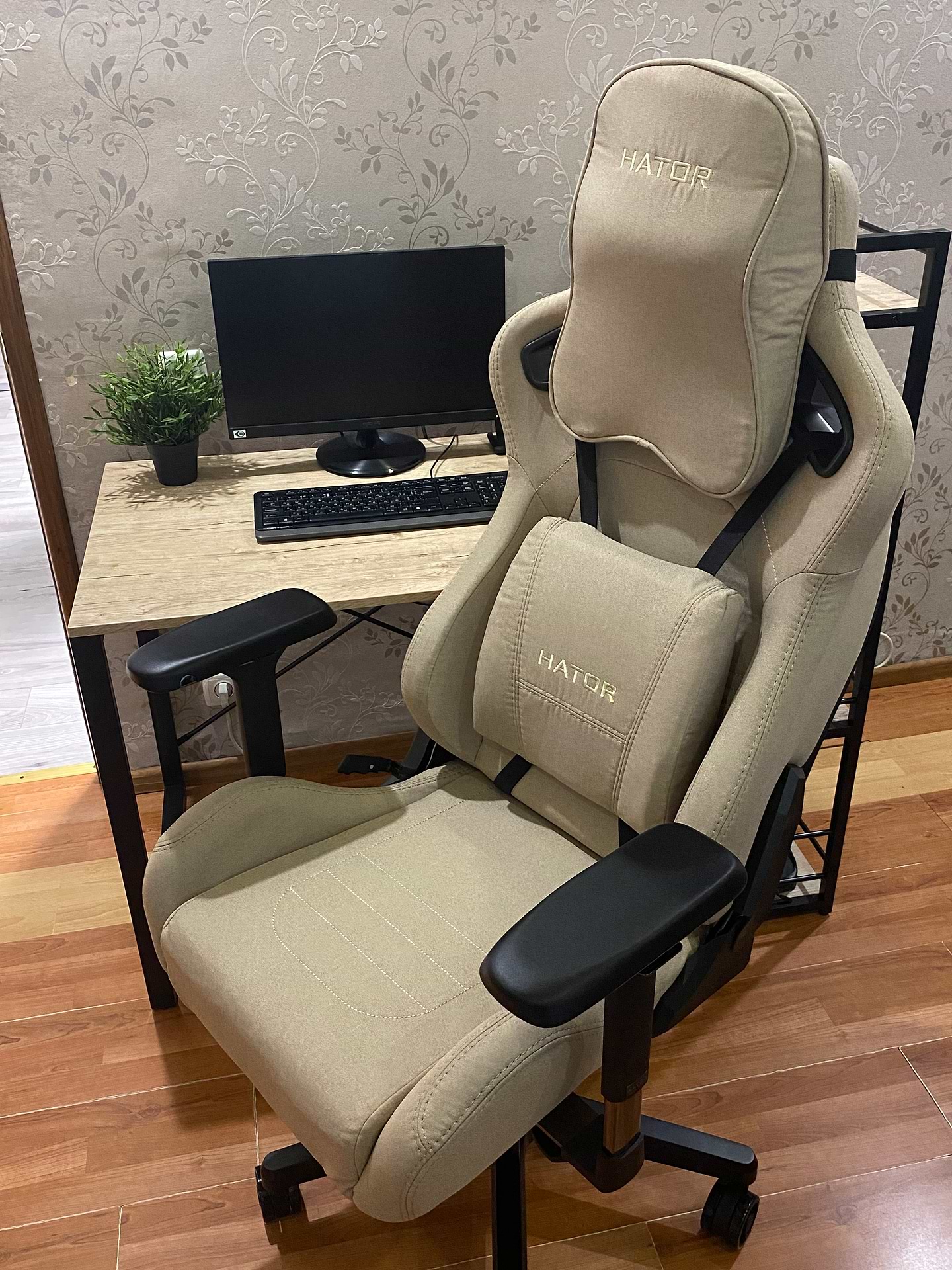 Зручне крісло і подушки. Регулювання усього на світі, можна хоч лежачи працювати. Оббивка тканиною міцна и приємна на дотик.
