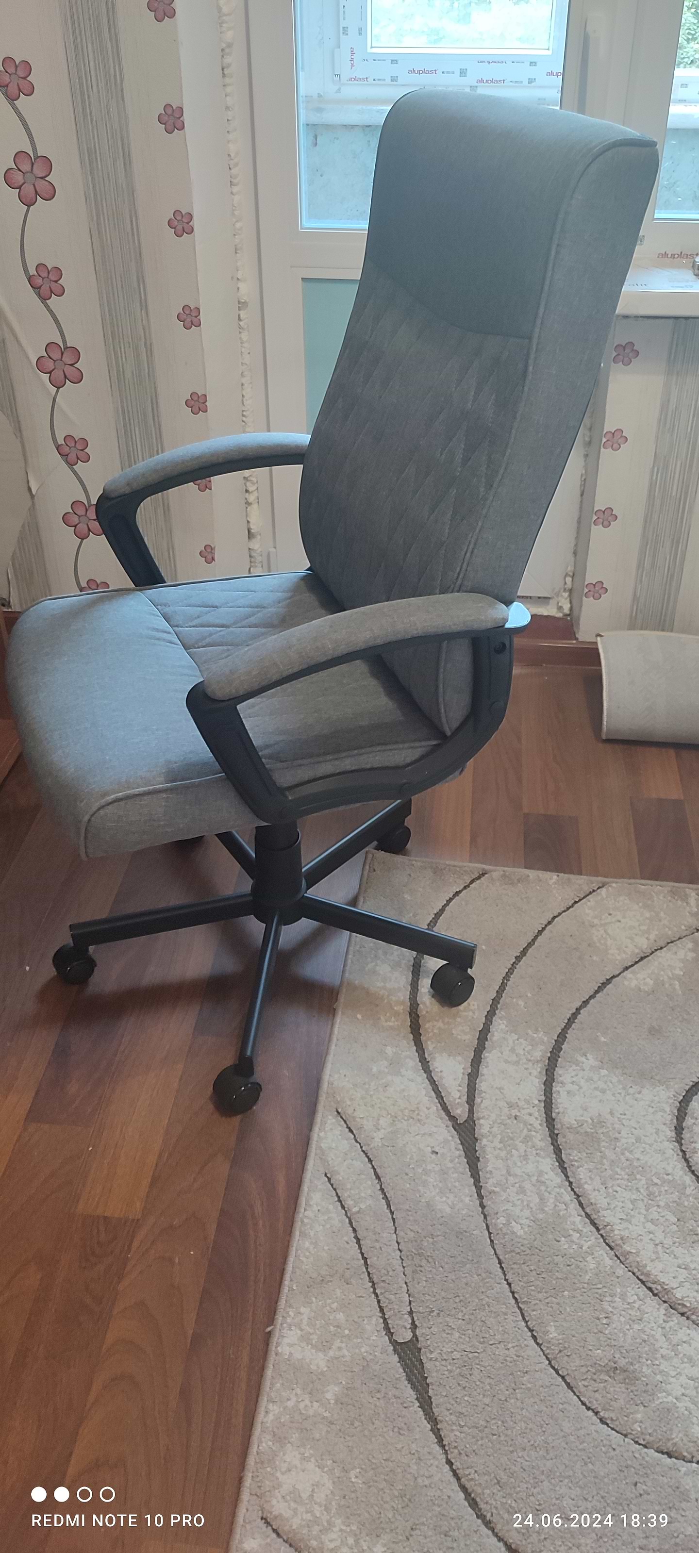 Удобное кресло для работы за компьютером. Сидение мягкое, регулируется по высоте. Спинка высокая, с анатомическим изгибом в районе поясницы, поэтому спина не устаёт даже после нескольких часов сидения за компом. Колёсики отлично ездят по полу. Имеется режим качания.