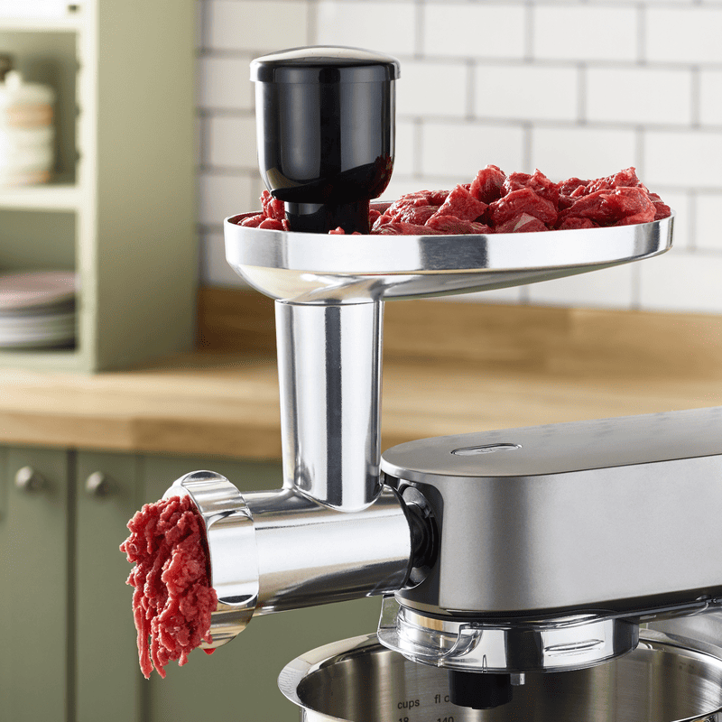 Міцна металева конструкція допомагає м'ясорубці з легкістю подрібнювати м’ясо, морепродукти, овочі та фрукти. Вона стане в пригоді під час приготування мусів, паштетів та мусів. Конструкція насадки включає три решітки з отворами 3 мм, 4,5 мм і 8 мм, а також надійні сталеві леза.