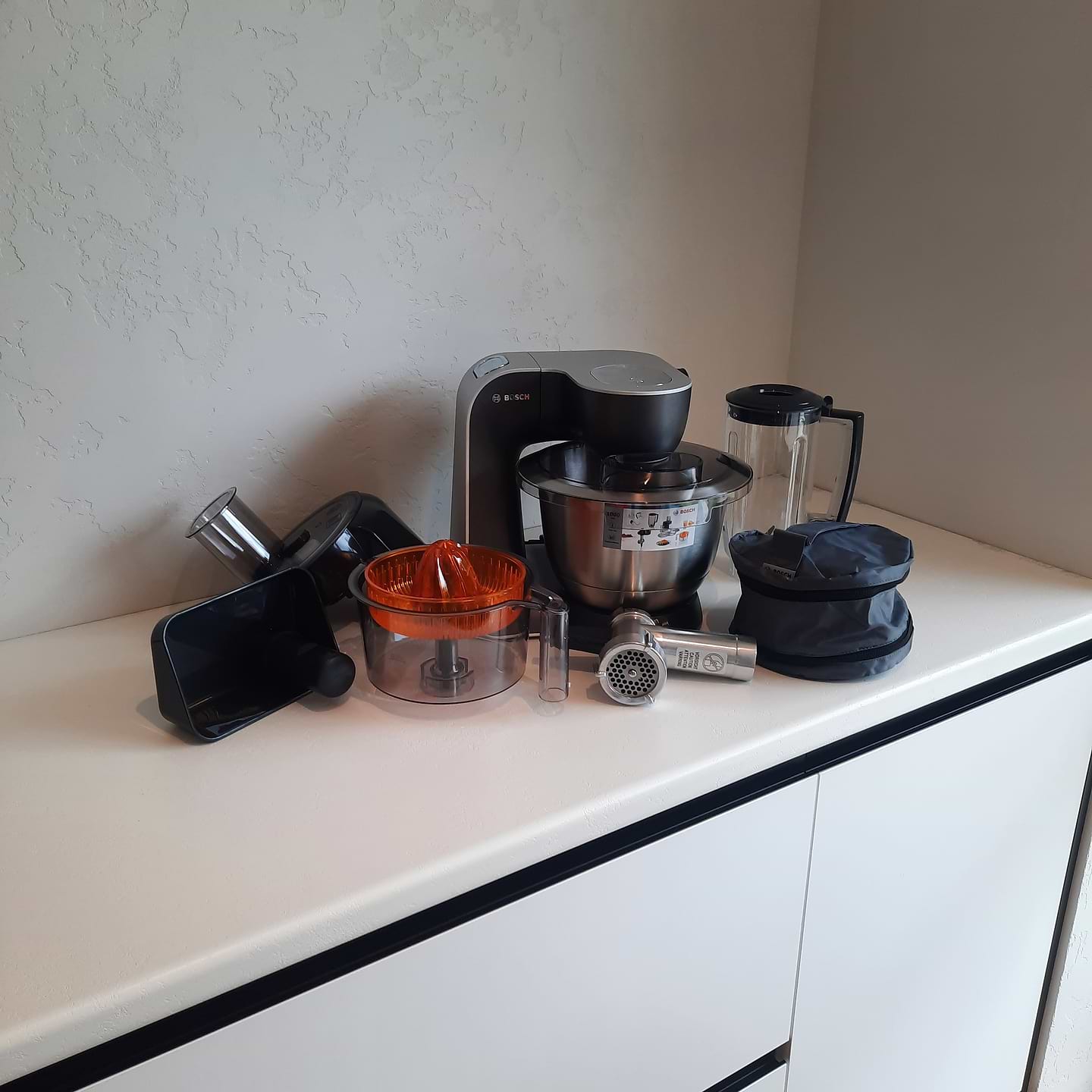 Стильна, займає мало місця, дуже багато насадок. Чаша для тіста фіксується, всі насадки в класному чохлі, що є плюсом, не буде все розкидано по тумбочками, м'ясорубка має упор на стіл (але мінус в тому що тільки одна насадочка в м'ясорубці потрібно докуплять)