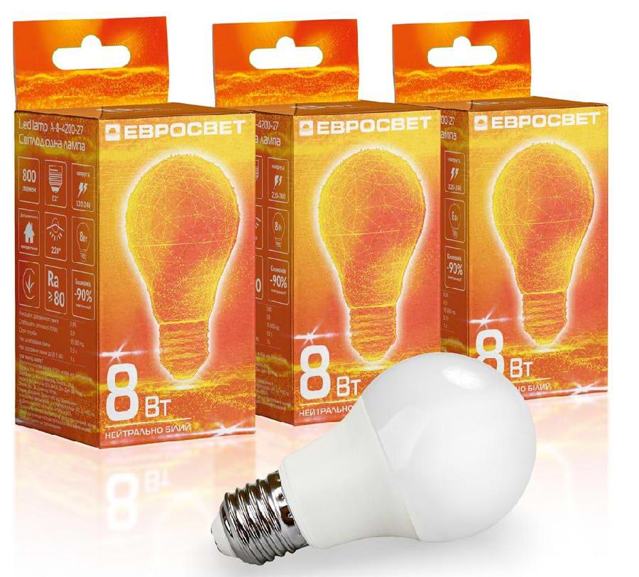 Все про Лампочка світлодіодна Євросвітло 8Вт 4200К A-8-4200-27 Е27 3 шт. (000058956)