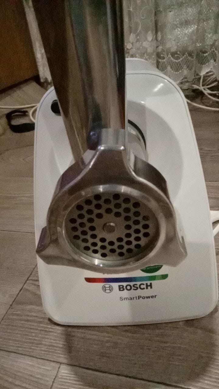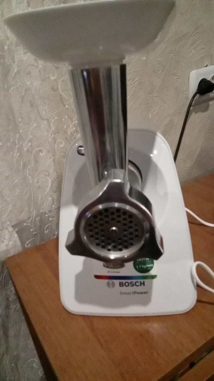 Мясорубка Bosch имеет мощный двигатель 1500 Вт, что позволяет, благодаря большому выходному отверстию диаметром в 5 см, переработать до 1.7 кг мяса в минуту.
