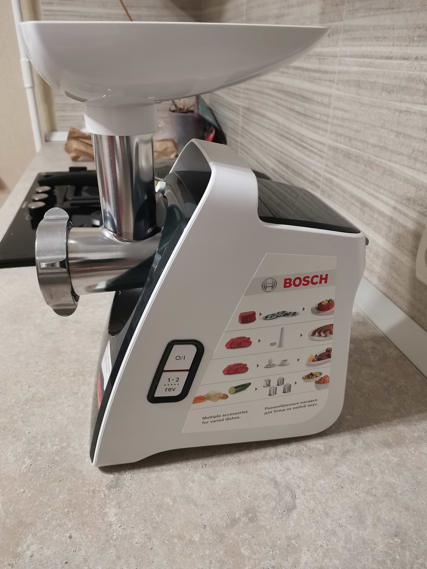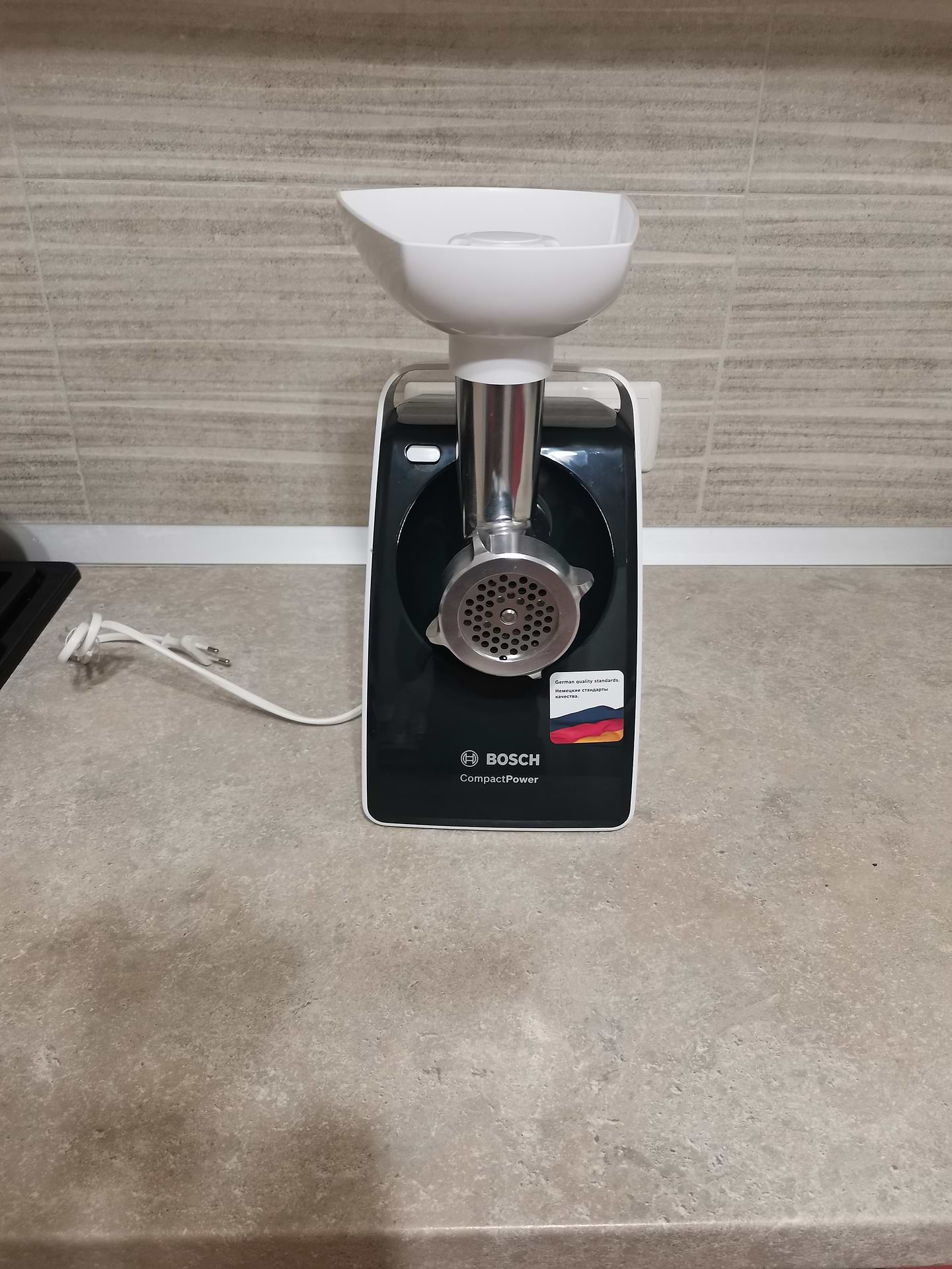 Покупал мясорубку на подарок. Хорошая вещь, но есть нюансы: 1. После сматывания провода внутрь корпуса он завязался внутри на узел и теперь провод полностью не вылезает из корпуса, а самому разобрать и достать не вариант, так как слетит гарантия. .