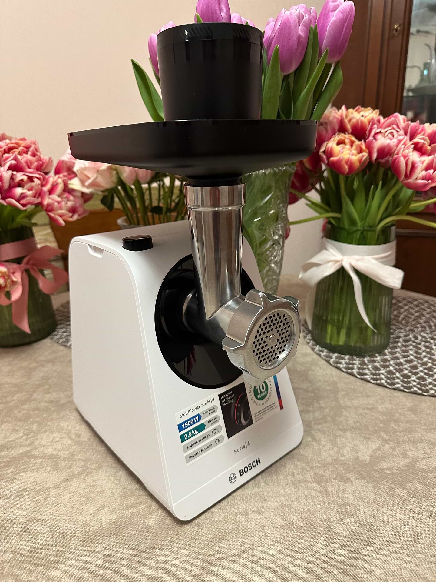 Отримала м'ясорубку в подарунок. Дуже сподобався дизайн та функціональність. Єдиний нюанс - в комплекті тільки маленька та крупна решітка, середню необхідно докуповувати.