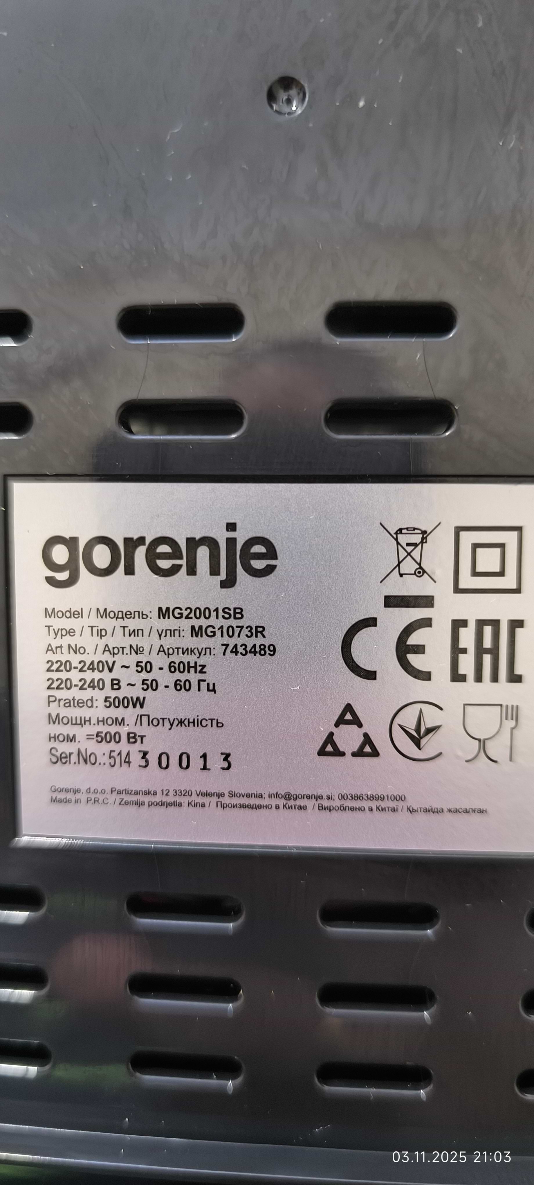 Опис М'ясорубка Gorenje MG2001SB