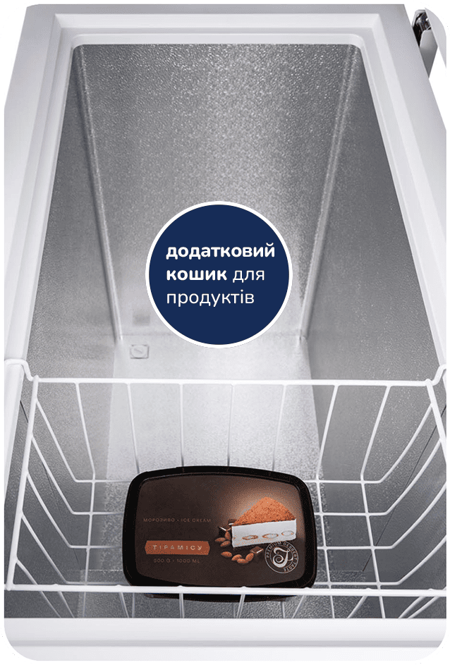 Морозильна скриня також оснащена додатковим кошиком - це не просто аксесуар, а зручний інструмент для організації простору. Він дозволяє зберігати продукти, такі як морозиво, заморожені ягоди або зелень, окремо і полегшує їх знаходження.
