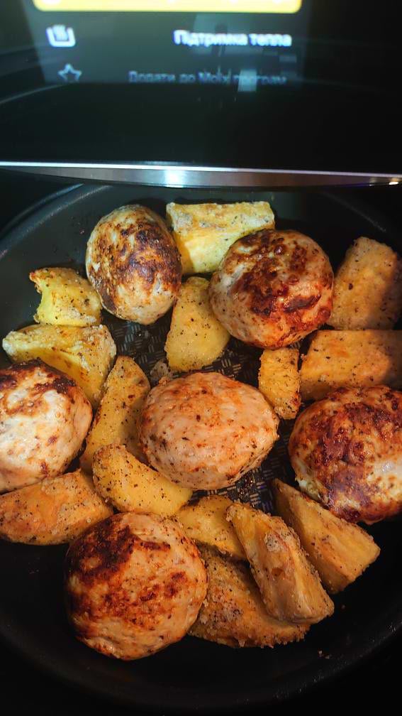 Готує дуже швидко і смачно. М'ясо соковите всередині та зі підсмаженою скоринкою зовні. картопля і сира і заморожена -супер! Дитина дуже любить фрі. Ця мультипіч для нас просто знахідка. Готуємо з краплинкою оліі, без літрів фрітюру.
