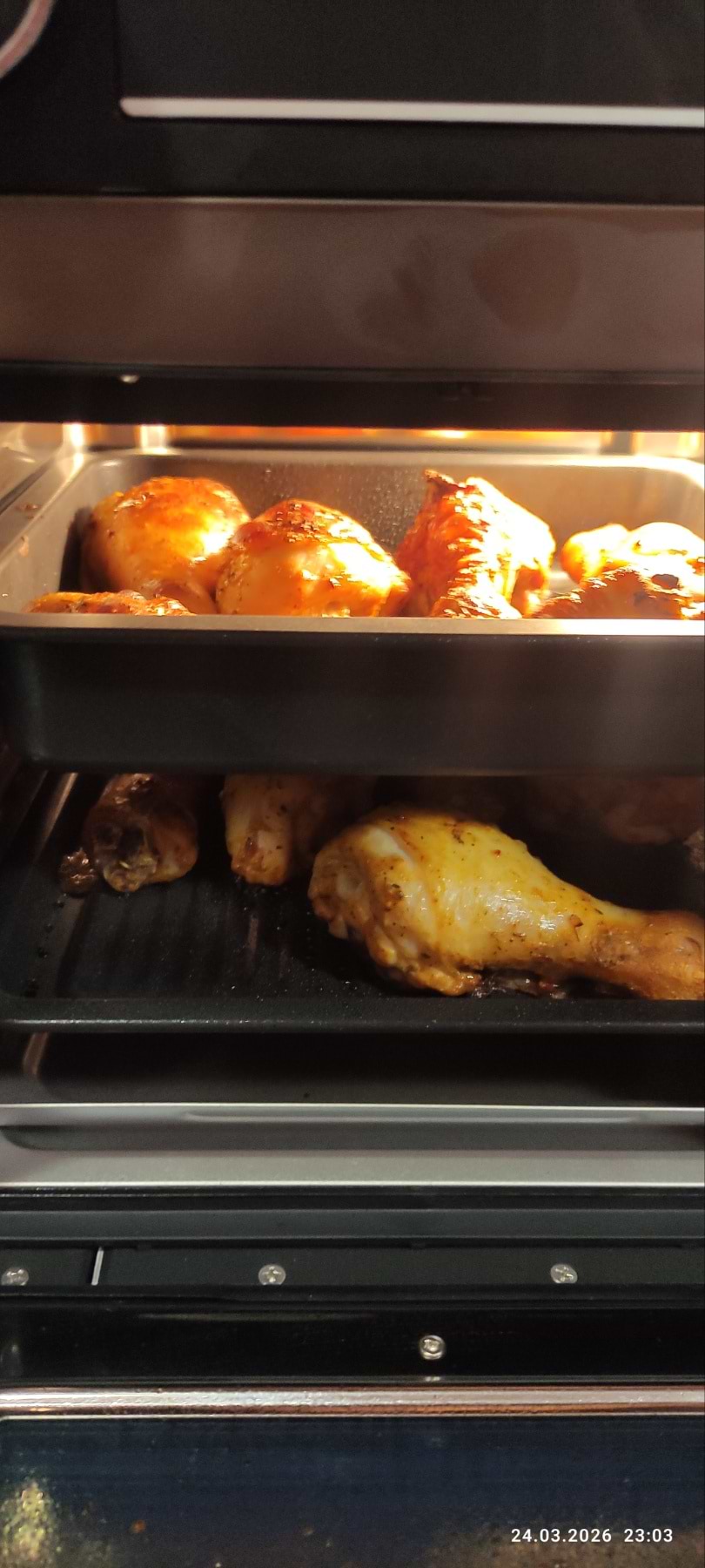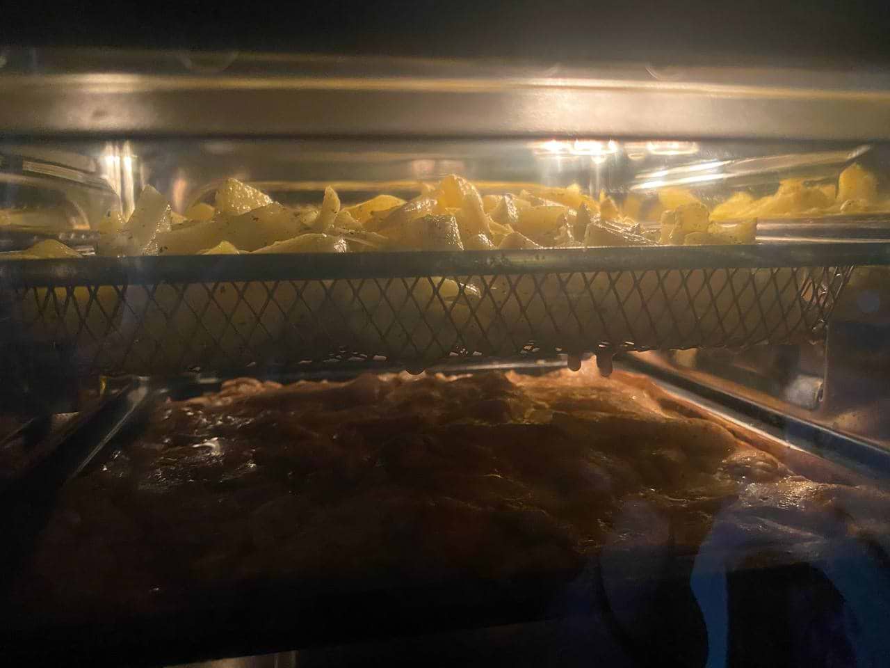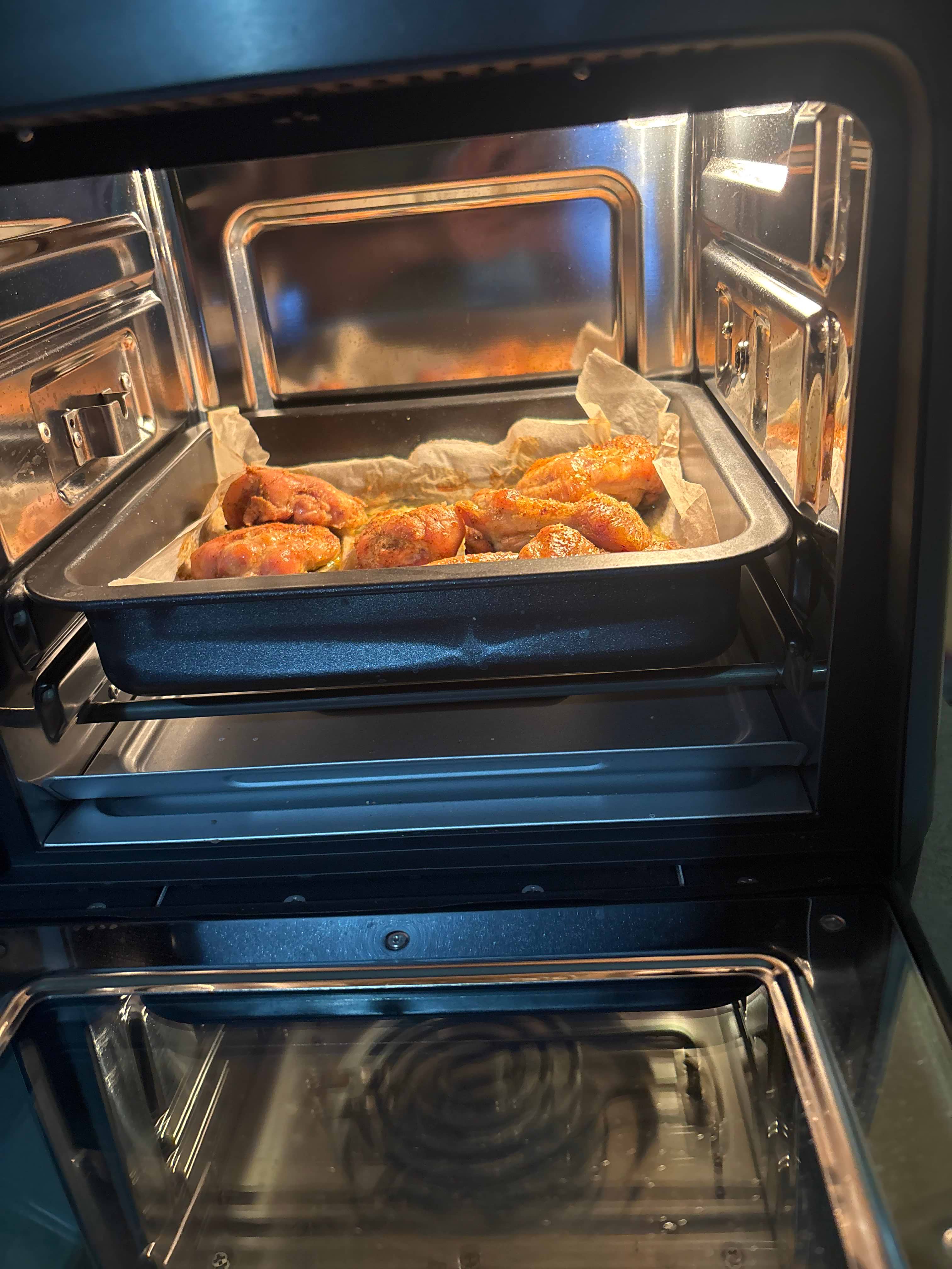 Якщо електродуховка відсутня або необхідно приготувати невелику порцію, то ця мультипіч її повністю замінить, бо має два тени, необхідні дека та решітки у комплекті.