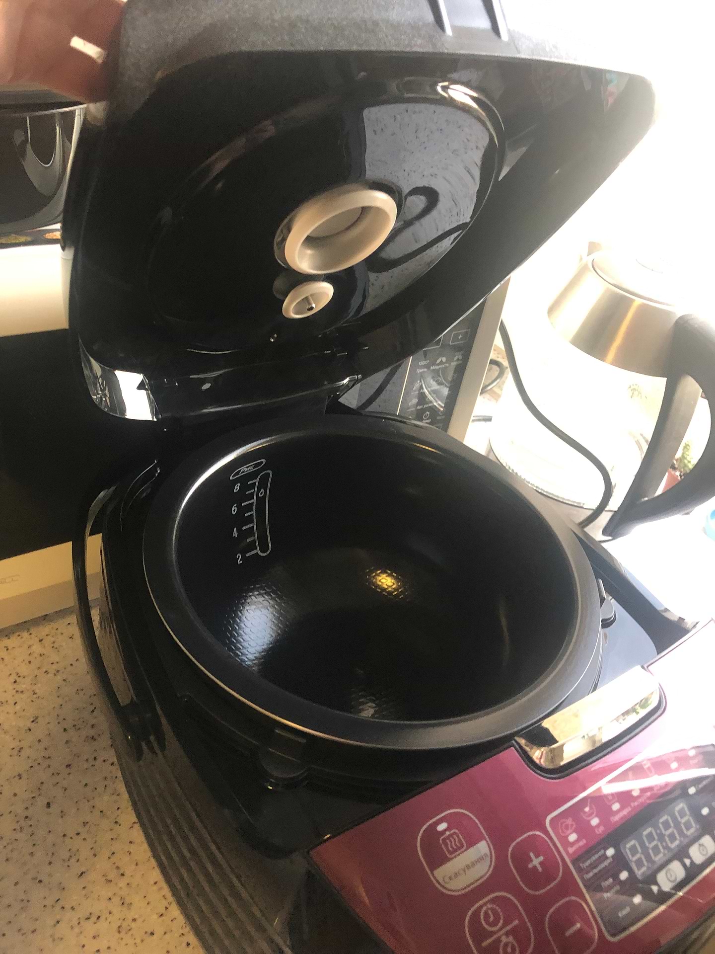 Минусы— был запах дешевого пластика, пара кипячений воды с лимоном и проблема решена; мелкий шрифт панели управления; программа суп— сильно кипит бульон получается мутным;