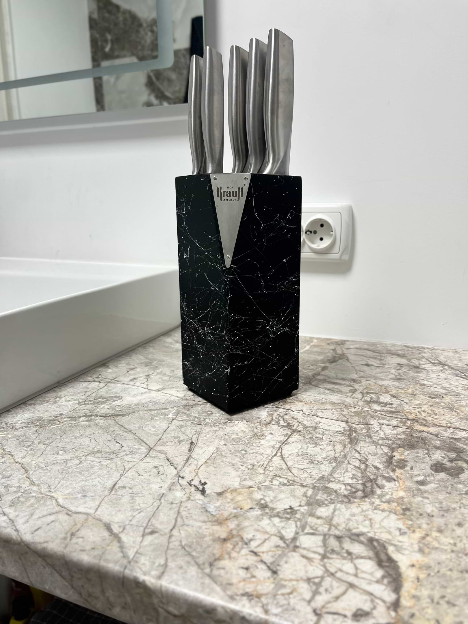 прекрасные ножи, очень острые, шикарно смотрятся на кухне! подставка под мрамор выглядит очень достойно! брали на подарок, маме понравились безумно