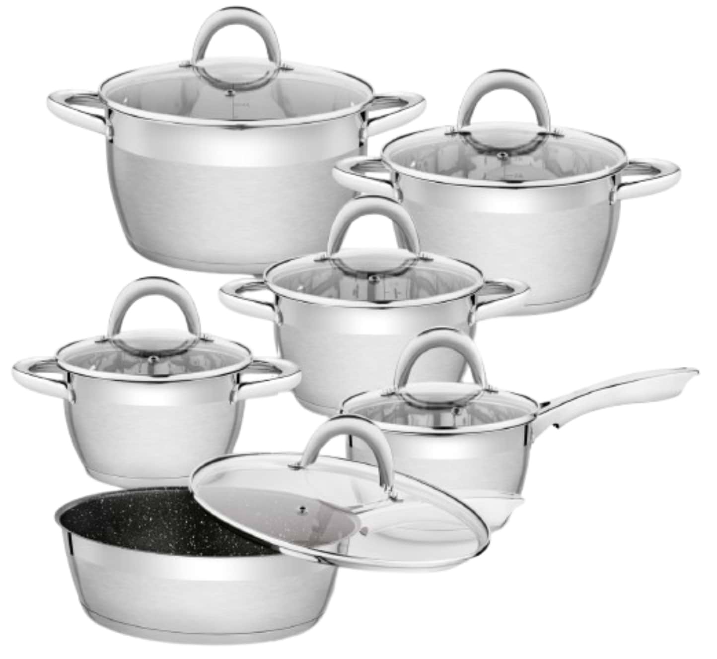 Каструля - 16 см/1,7 л, Каструля - 18 см/2,2 л, Каструля - 20 см/3,3 л, Каструля - 24 см/5,8 л, Ківш – 16 см/1,7 л, Кришка скляна – 18 см, Кришка скляна – 20 см, Кришка скляна 16 см - 2 шт., Кришка скляна 24 см - 2 шт, Сковорода – 24 см