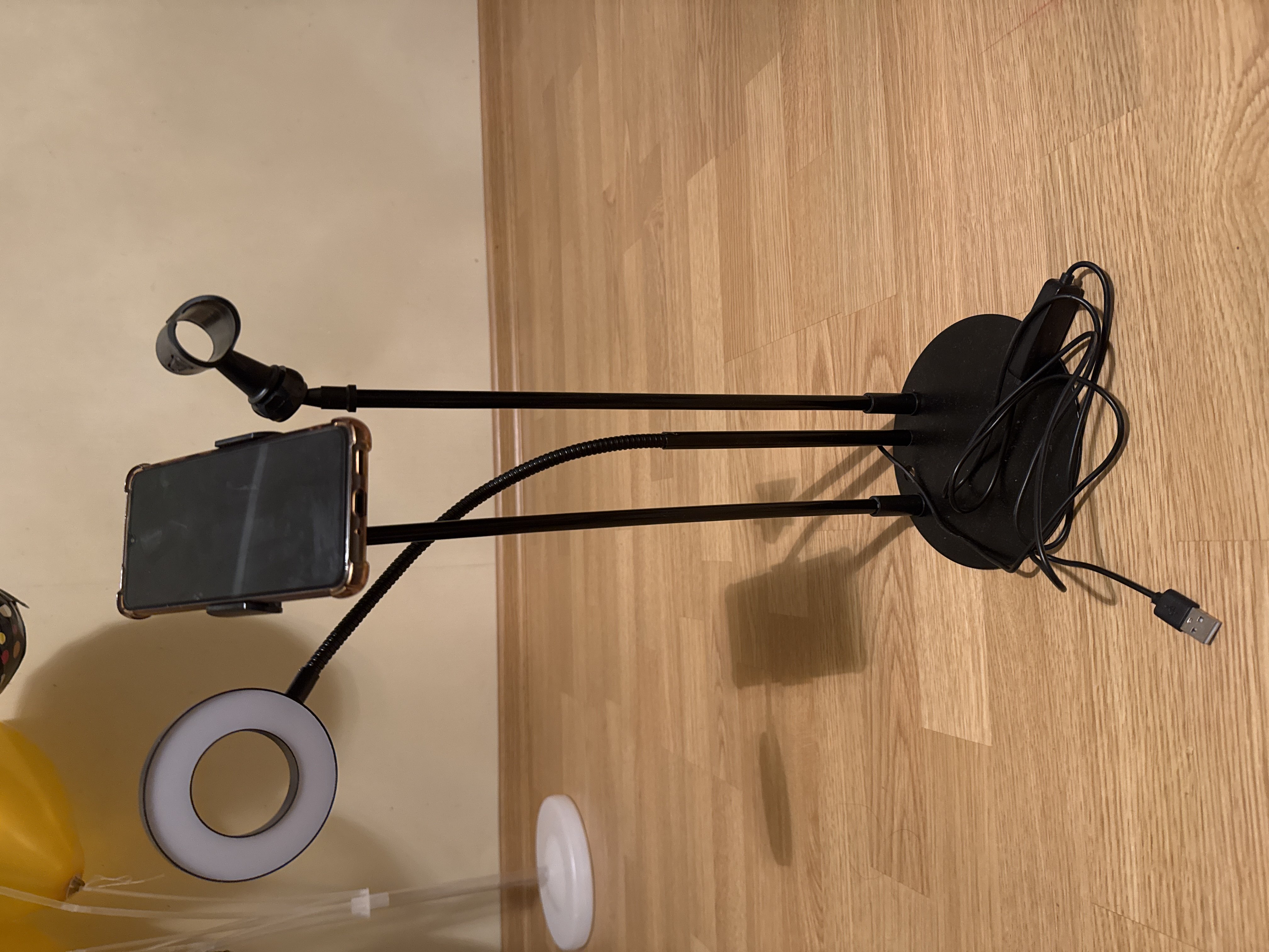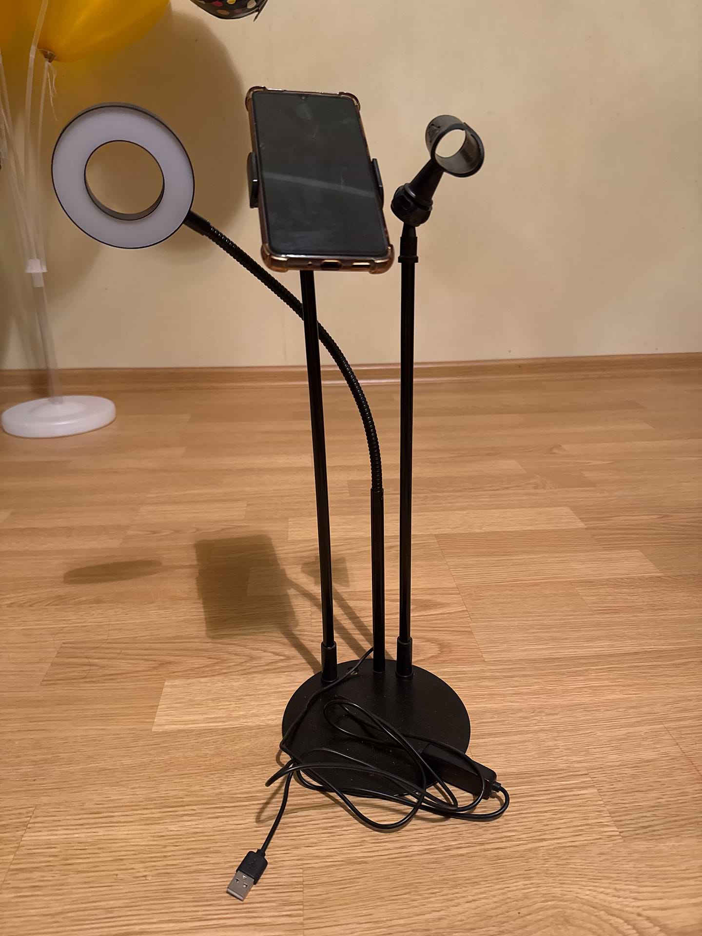 не відповідає опису . тримач для телефона і мікрофона не згинається , як показано на фото. телефоном не можливо знімати, тому що камера дивиться в стелю . дочка дуже розстроілась . також не працює лампа без розетки. гнеться тільки лампа і то вона закоротка .