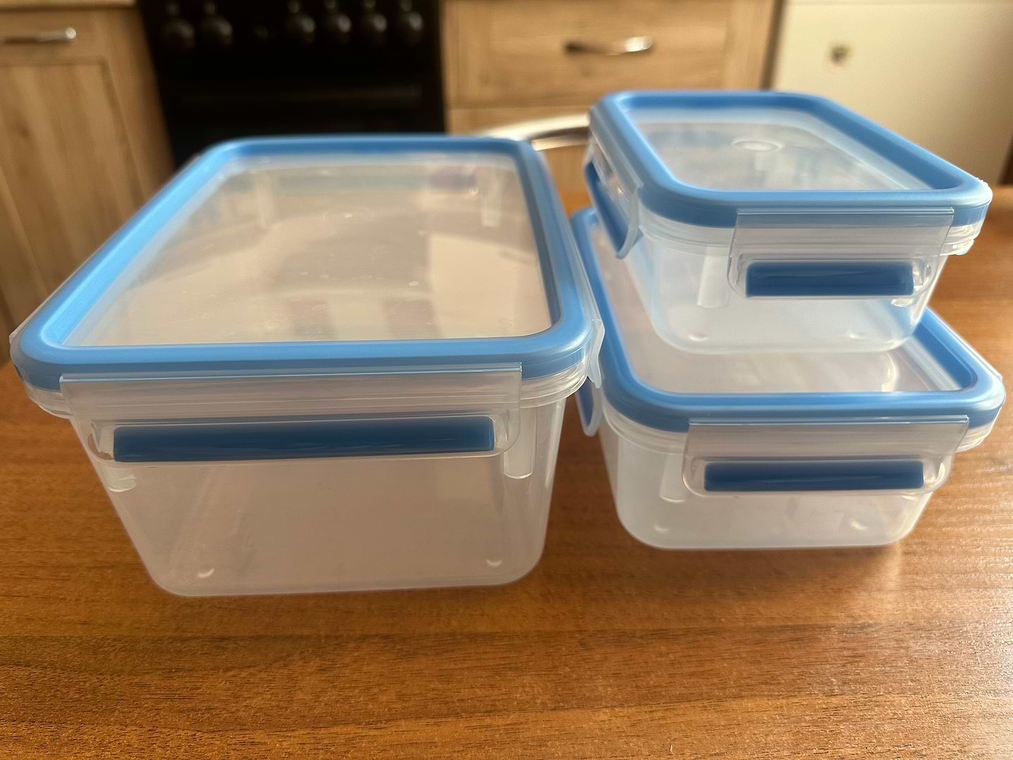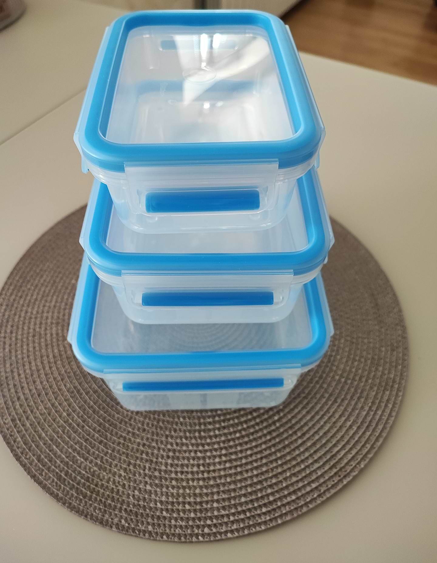 Дуже добрі контейнери. При першому відкритті не було запаху пластику. Не треба бути Гераклом, щоб їх закрити, але при цьому закриваються дуже щільно. Хороші розміри та займають мало місця