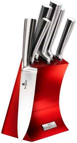 Данный набор ножей получила в подарок от коллег по работе. Качественная сталь, которая идеально смотрится на кухне. Ножи очень удобные, лезвие острое. Комфортно держать в руке, при длительном использовании рука не устает. Подставка в красном цвете, по особенному смотрится на кухне. Можно быть в посудомойке, после мытья не остается разводов. Рекомендую