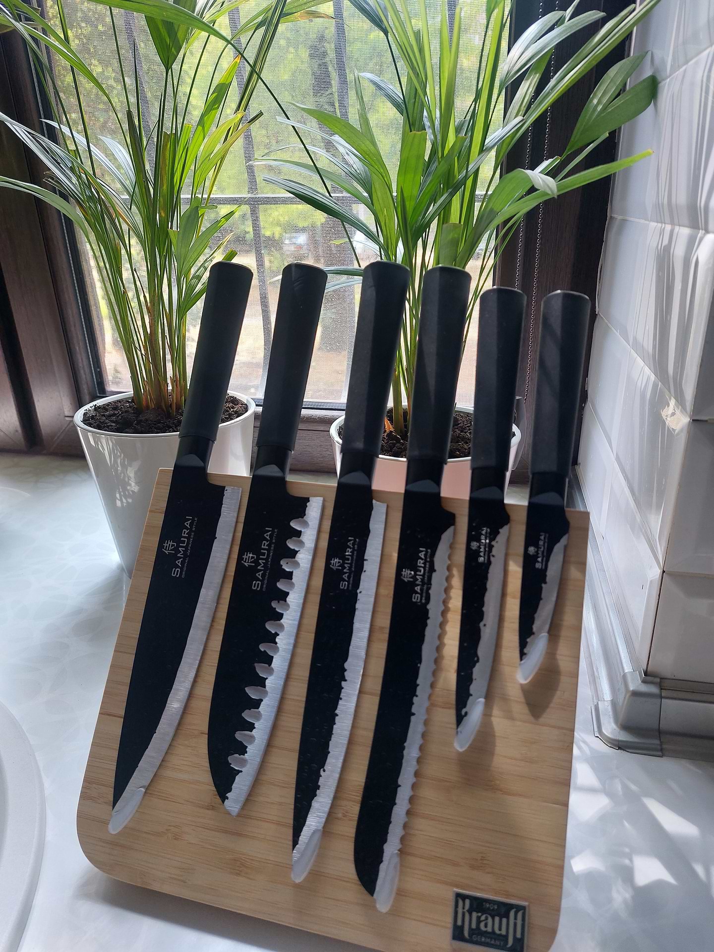 Крауф беру не впервые – норм качество. Ножички острые, сталь хорошая - пользуюсь каждый день и не тупятся, нарезать ими удобно. За счет рисунка на лезвиях и подставки с магнитом в общем смотрятся красиво на нашей кухне, как раз вписались в интерьер. На подставке держатся хорошо, не слетают сами по себе.