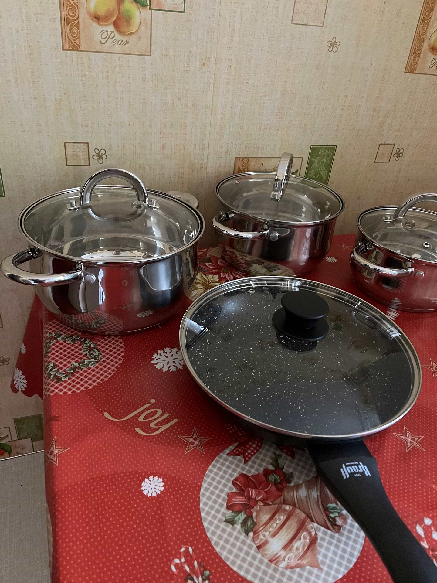гарний набір каструль, матеріал товстий. Розмір для невеликої сімʼї. Зараз гарна ціна.