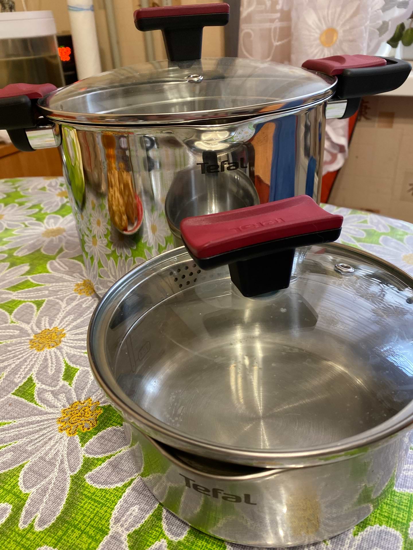 Супер крутой набор! Но сразу не обратила на него внимания из-за громоздких ручек. Оказалось, что в этих ручках есть волшебные фиксаторы, чтобы крышка не упала, когда воду сливаешь ( в крышке есть отверстия для слива ). Литраж внутри каждой кастрюльки указан, а на крышку можно ложить ложку либо вилку.