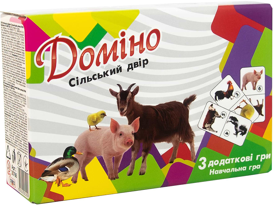 «Доміно Сільський двір»- популярна настільна гра в новому навчальному форматі. Тепер ігри стали не тільки веселими, а й корисними. Яскраві картки наочно продемонструють малюкові жителів сільської дворика, поліпшать його уважність і посидючість. Також в наборі є додаткові завдання, які допоможуть закріпити отримані знання!