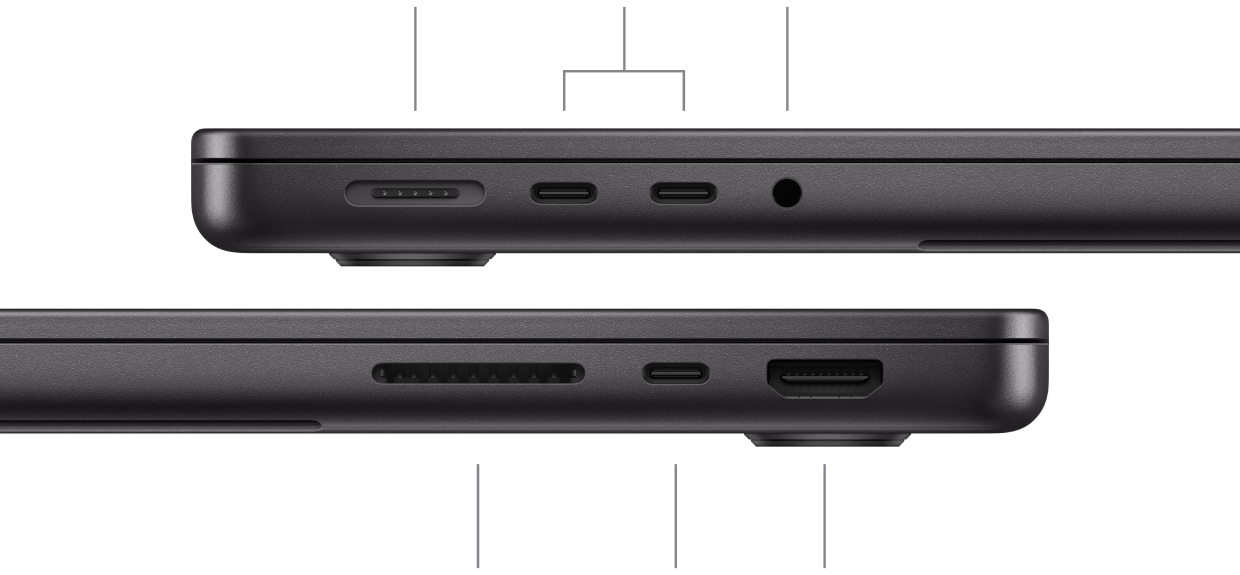 MacBook Pro оснащено трьома портами Thunderbolt 4 і зарядним портом MagSafe 3, слотом для SDXC-карт, портом HDMI та портом для навушників. А ще до нього можна підʼєднати до двох зовнішніх дисплеїв.