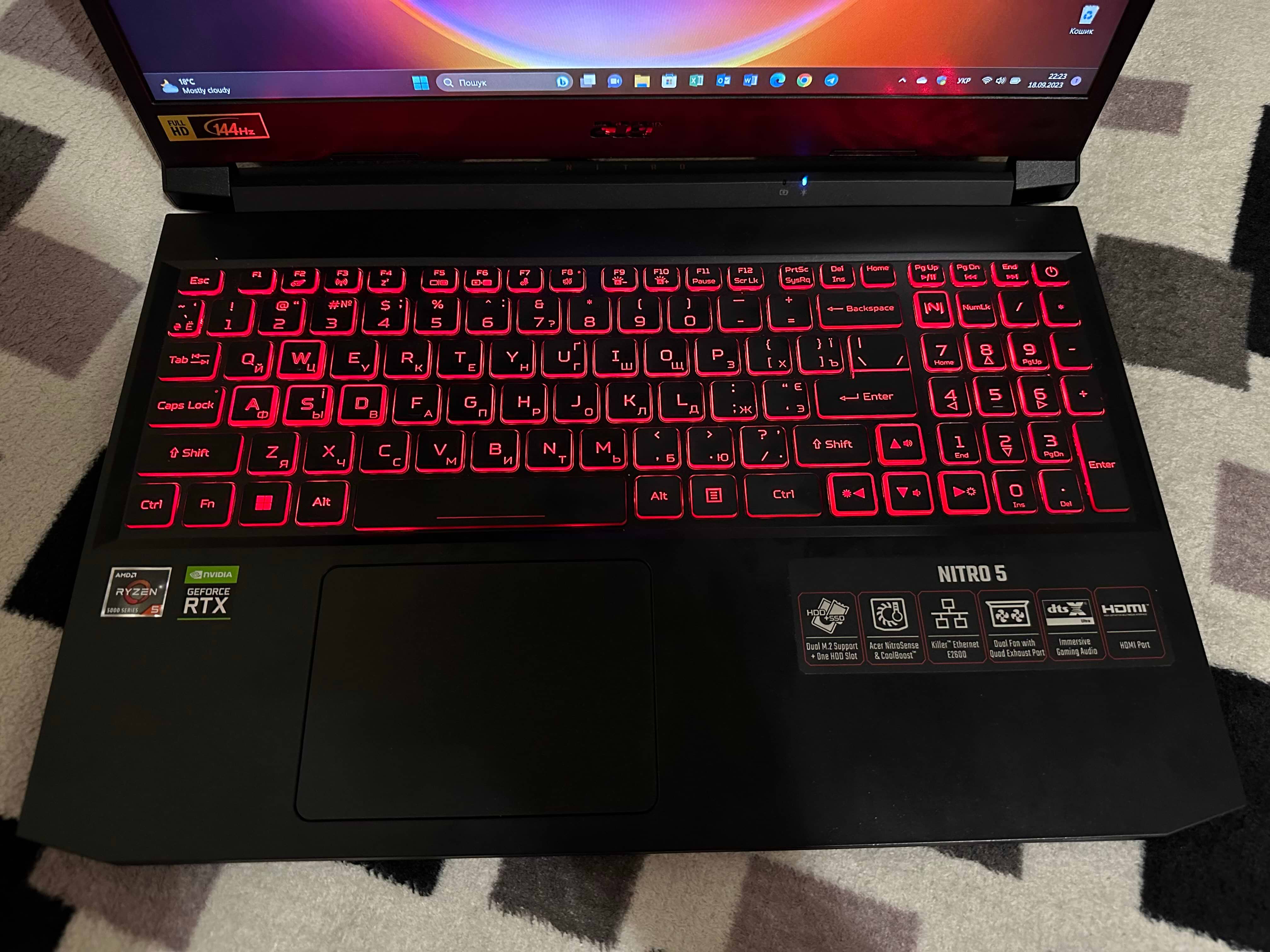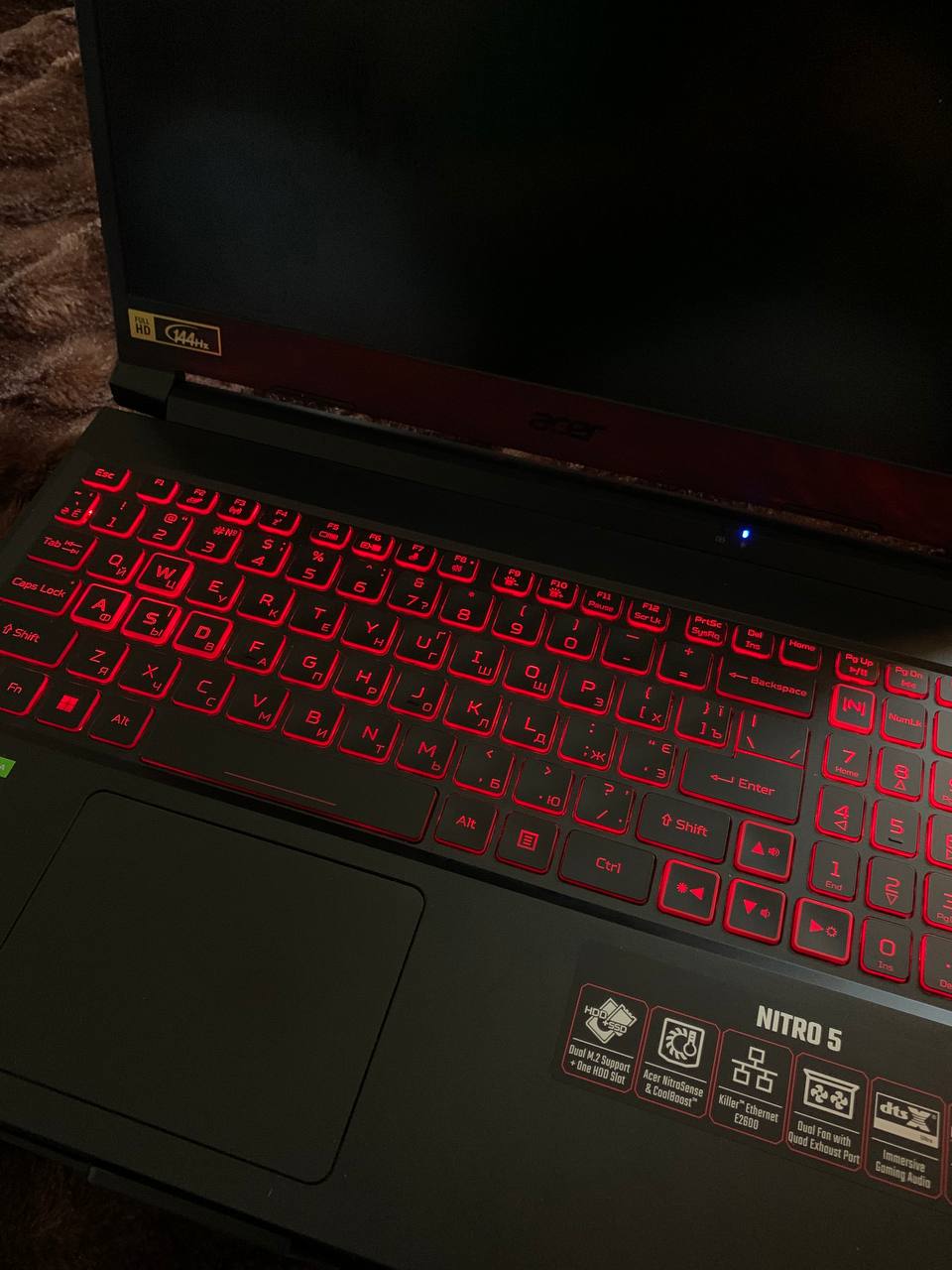 Клавіатура острівного типу з ходом (глибиною) натискання 1,6 мм задля зменшення відгуку. Світлодіодне підсвічування червоного кольору допоможе при роботі в умовах недостатнього освітлення. Клавіші WASD та кнопки "стрілок" забезпечені додатковим виділенням. Клавіатуру Nitro 5 відрізняє гравіювання англійських символів та кирилиці, виконане в заводських умовах.