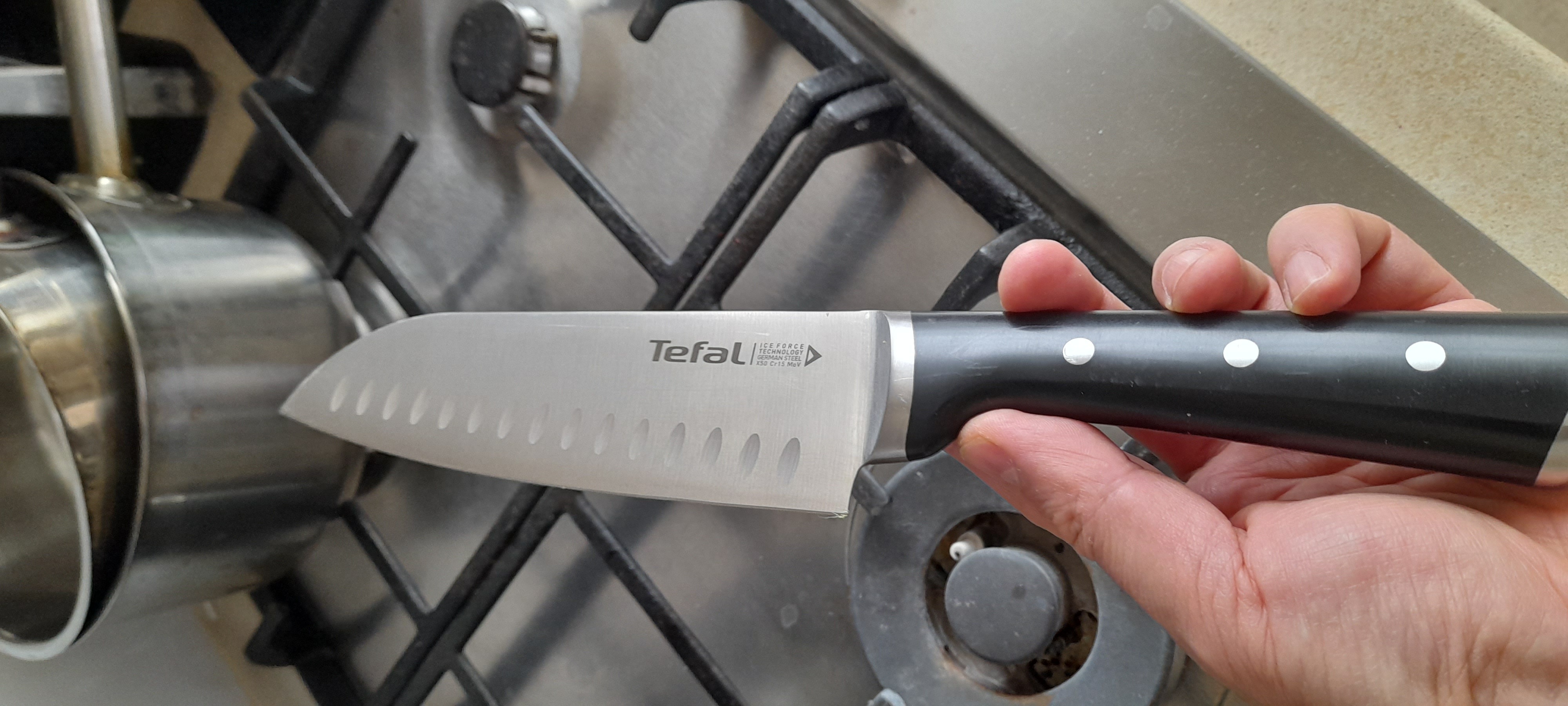 Чудовий ніж, зручний для будь-яких нарізок, чи то м'ясо, чи то овочі нарізає ідеально. Купила одразу точило, та за 3 міс ще не користувалася, дуже задоволена ним.