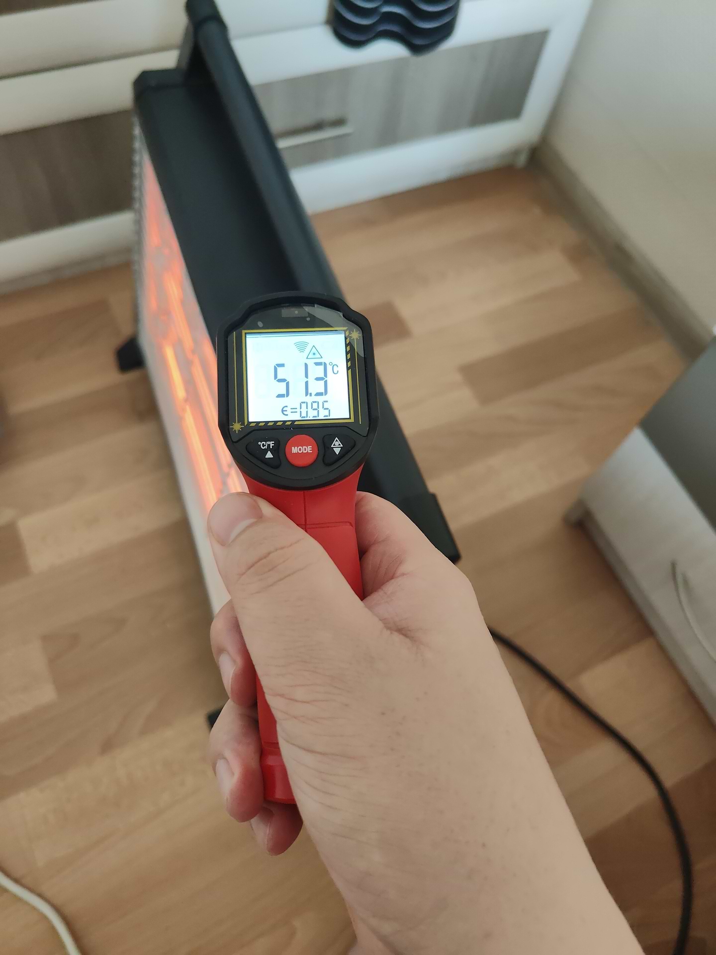Сам обігрівач нагрівається, але як на мене, то не критично. На фото температура поверхні і вона максимально нагрілася 68.7, але потім впала до 50+ градуса. Бокові поверхні нагріваються до 37 градусів. Це показники під час максимальної температури, що видає прилад.