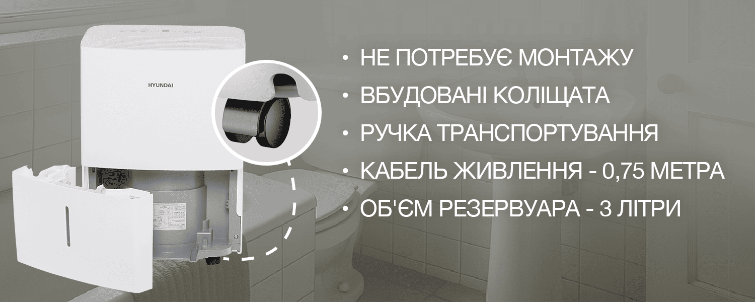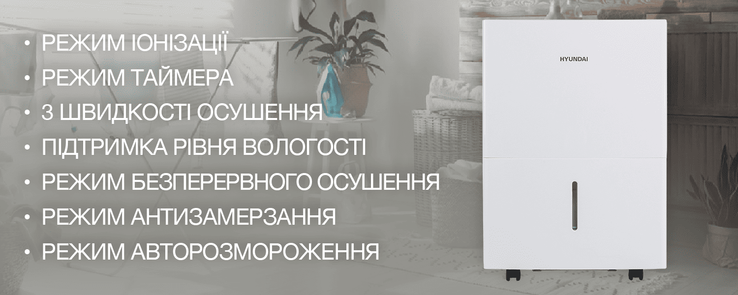 Побутові осушувачі повітря HYUNDAI — це найкращий вибір користувача, який дбає про оптимальну вологість у квартирі, будинку чи офісі. Прилади поєднують компактність, надійність та енергоефективність, завдяки чому створюють здоровий і комфортний мікроклімат у приміщеннях площею від 37 до 52 м². Осушувачі працюють за принципом конденсаційного осушення: вентилятор подає вологе повітря на охолоджений випарник, де зайва волога конденсується та стікає у резервуар. Далі осушене повітря проходить через теплообмінник, трохи підігрівається і повертається назад у приміщення. У серії представлено кілька моделей із різною продуктивністю — їх можна підібрати відповідно до площі кімнати та кількості вологи, яку необхідно видаляти щодоби.
