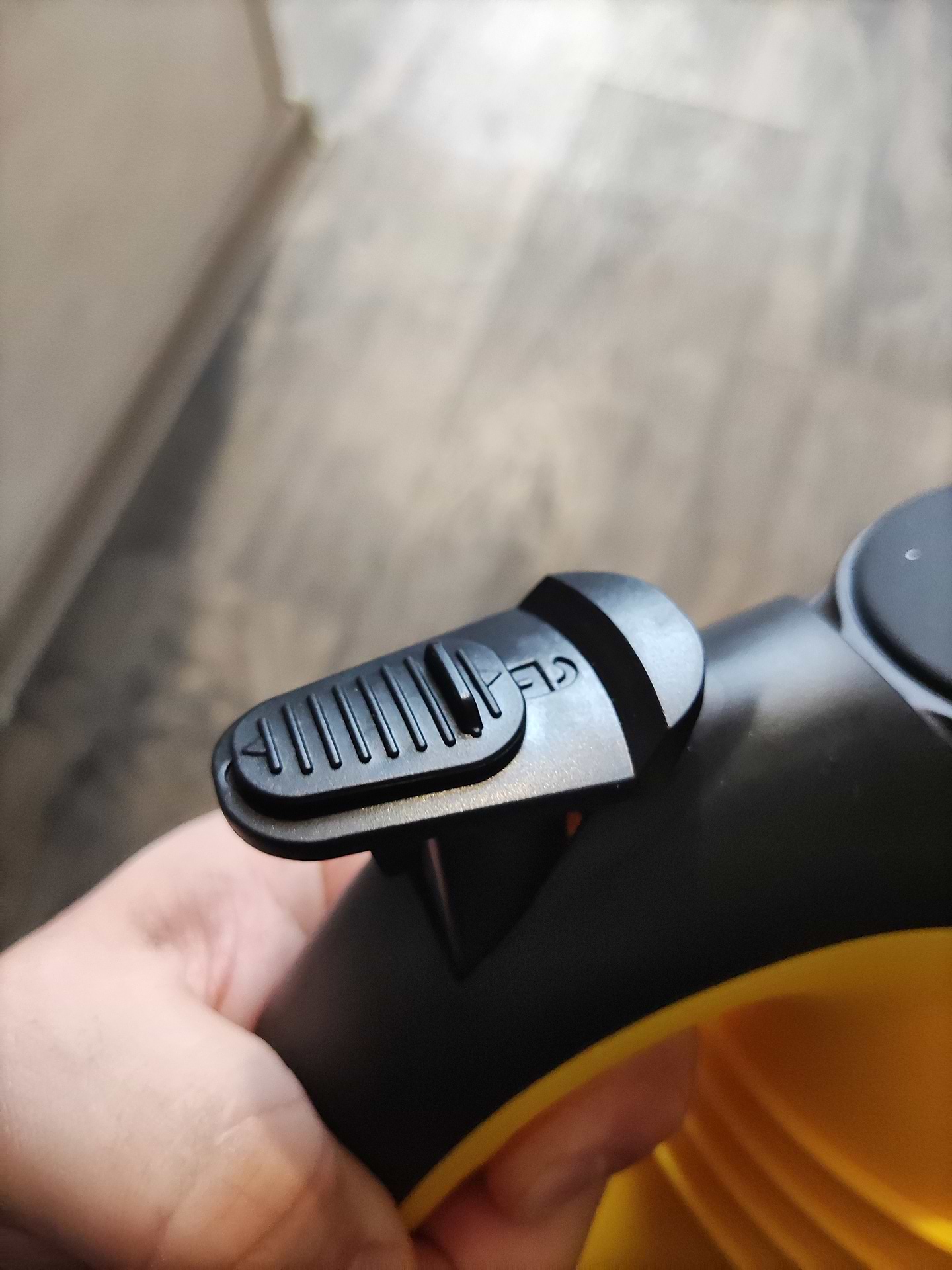 Дехто пише що є фіксатор для кнопки, але його нема. Є лише запобіжник від випадкового натискання.