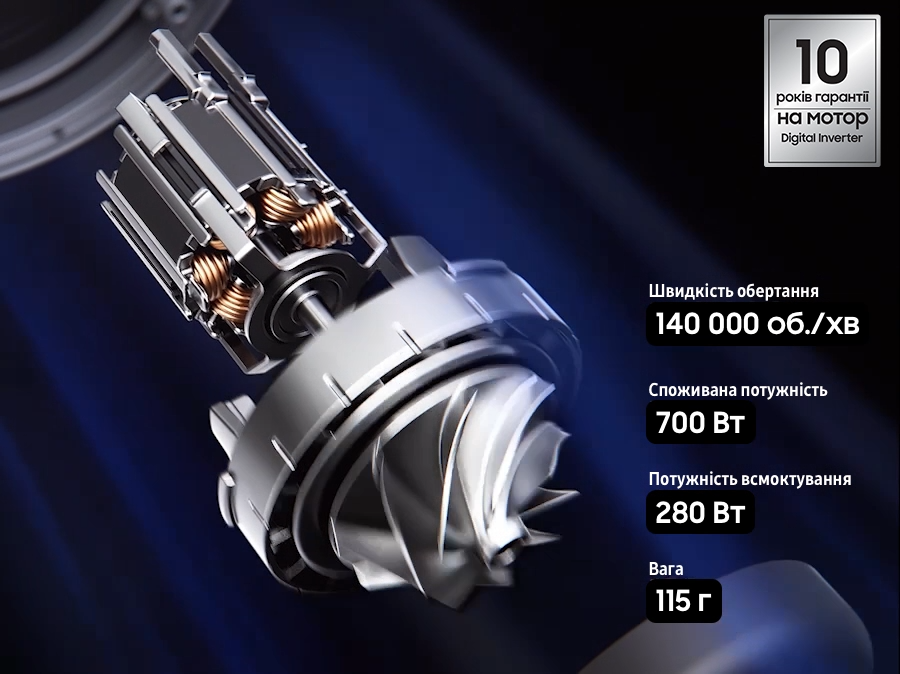Новітня конструкція мотора HexaJet полегшує процес прибирання, водночас роблячи його набагато ефективнішим: потужний повітропотік суттєво вплинув на швидкість та якість роботи пилососа. Протягом 10 років діє гарантія на цифровий інверторний мотор, що забезпечує тривале продуктивне використання пилососа. Двигун обертається зі швидкістю 140 000 обертів за хвилину, а потужність всмоктування сягає 280 Вт.