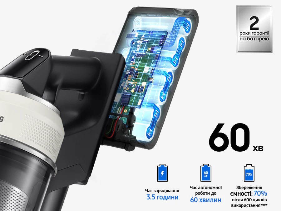 Тепер ви можете прибрати весь будинок без необхідності підзаряджати пристрій. Потужний (2 500 мА·год), але легкий акумулятор забезпечує роботу Samsung VS80F28DGS/UK Bespoke AI Jet Lite до 1 години. Якщо необхідно більш тривале прибирання, можете замінити розряджену батарею на запасну - так прибирання триватиме до 2 годин. На акумулятори діє дворічна гарантія, що гарантує впевненість та безпеку під час користування.