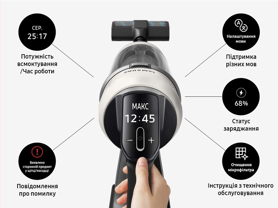Керуйте пилососом і слідкуйте за його роботою через цифровий РК-дисплей із підтримкою кількох мов. На екрані відображається потужність всмоктування, залишковий час роботи акумулятора, рівень заряду під час заряджання, а також попередження про можливі несправності з підказками щодо їх усунення.