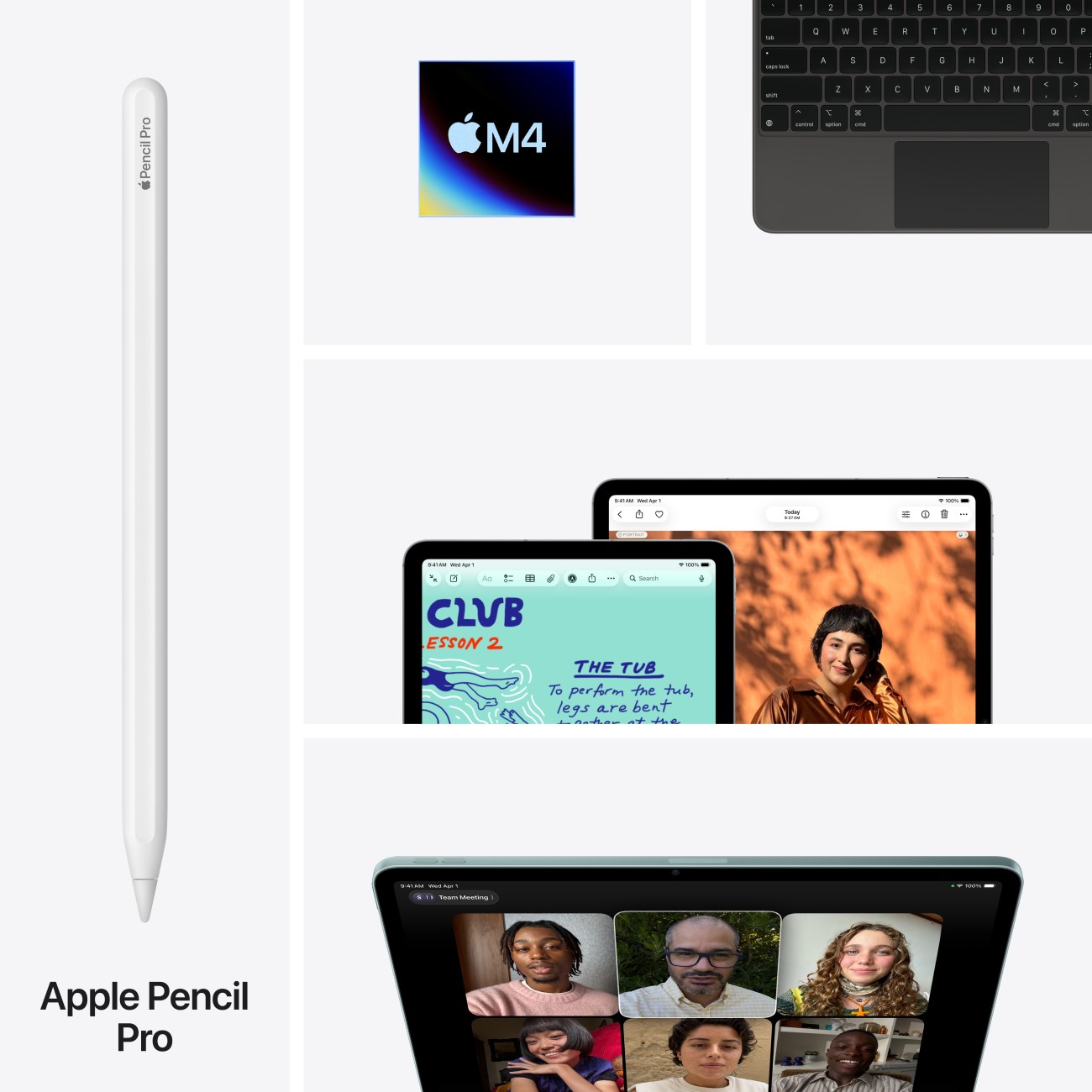 Apple Pencil Pro та Apple Pencil (USB-C) забезпечують інтуїтивне й точне керування для малювання, створення нотаток і творчості. Клавіатура Magic Keyboard забезпечує комфортний набір тексту та оснащена трекпедом із вібровідгуком.7