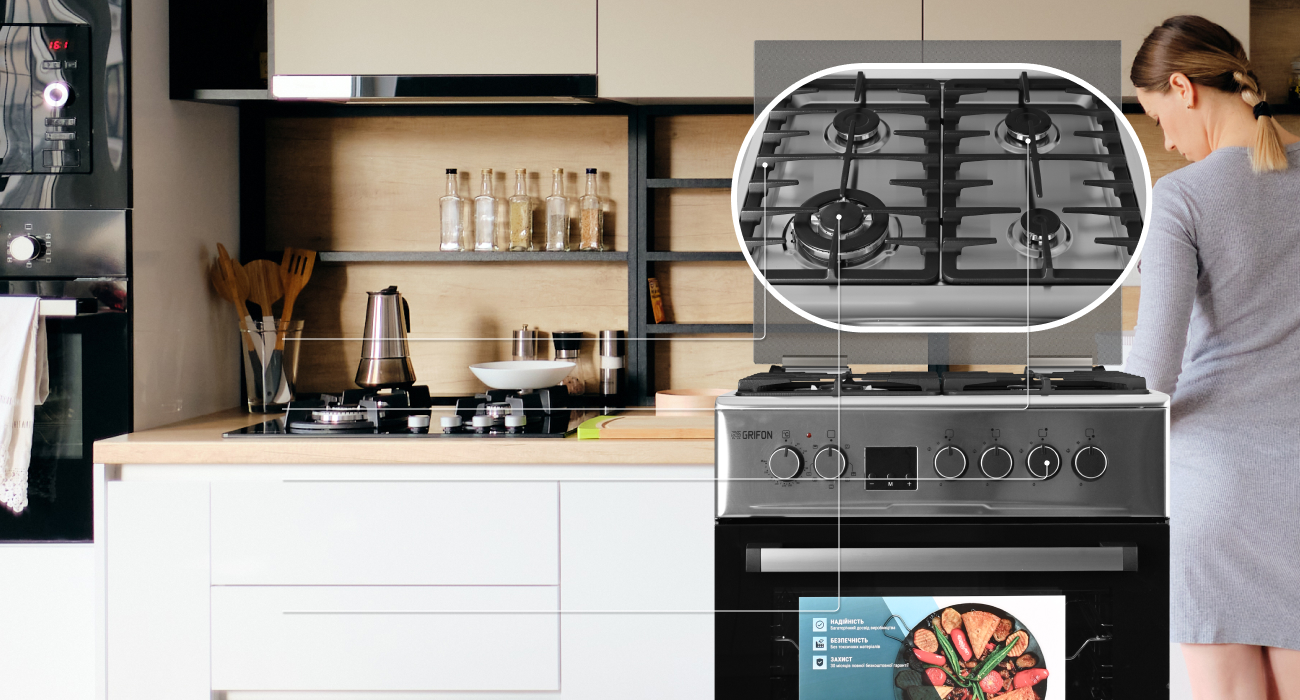 Всі плити Grifon оснащені функцією газ-контролю. Це означає, що витік газу при затуханні газової конфорки виключений, подача газу припиняється одразу при затуханні полум’я.