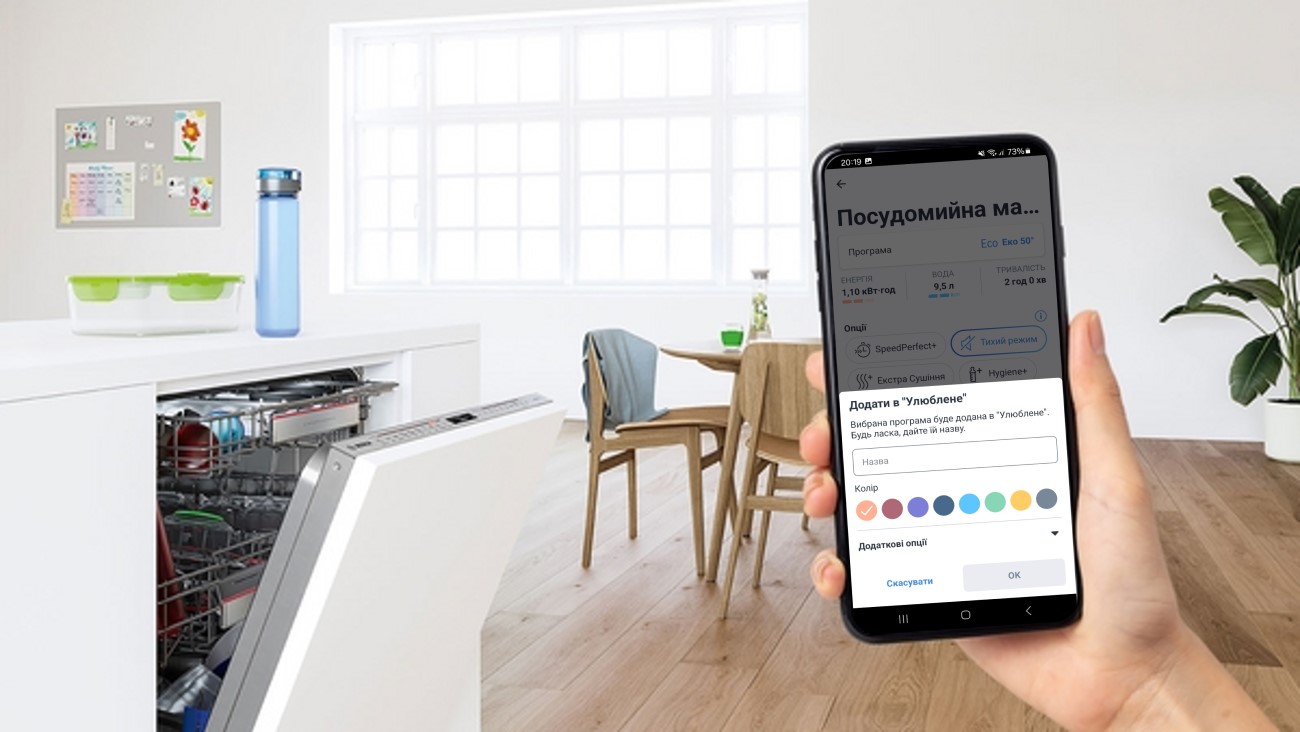 За допомогою функції «Улюблене» у застосунку Home Connect можна зберегти поєднання програми і додаткової опції як улюблену комбінацію, щоб надалі запускати цей режим одним дотиком із застосунку або кнопкою Favourite* на панелі приладу.