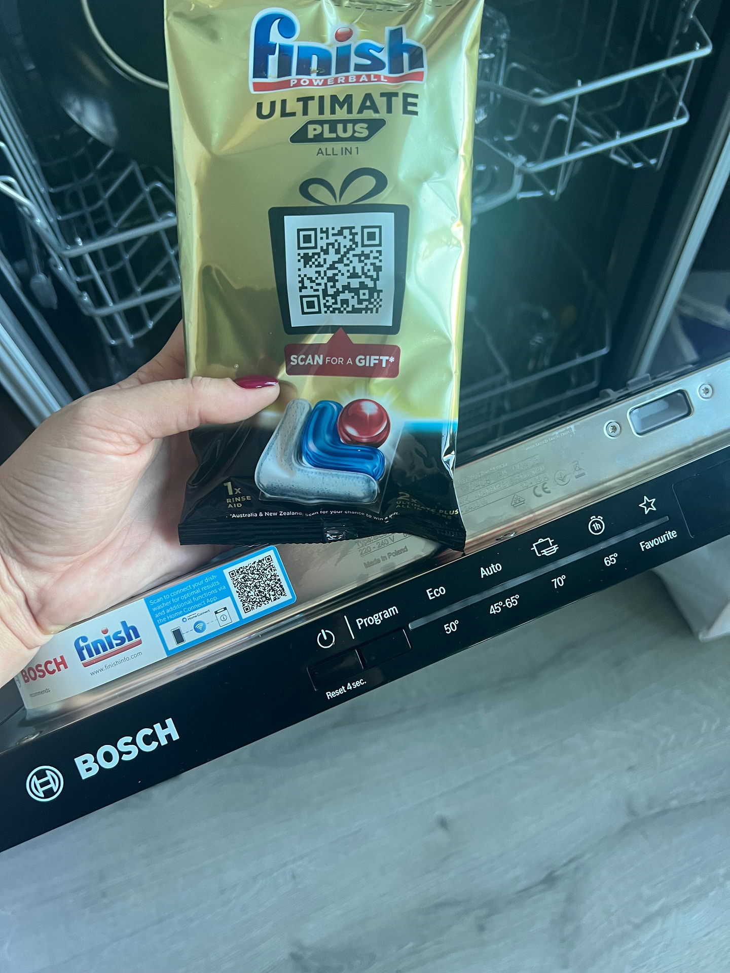 Дуже задоволені вибором саме цієї моделі посудомийки. Вмістка, тихо працює, миє і висушує посуд бездоганно. Є половинна загрузка і відстрочка часу. Зручне керування мийкою через додаток в телефоні Home Connect: включати її і контролювати час роботи. Приємним сюрпризом був подарунок від Finish)