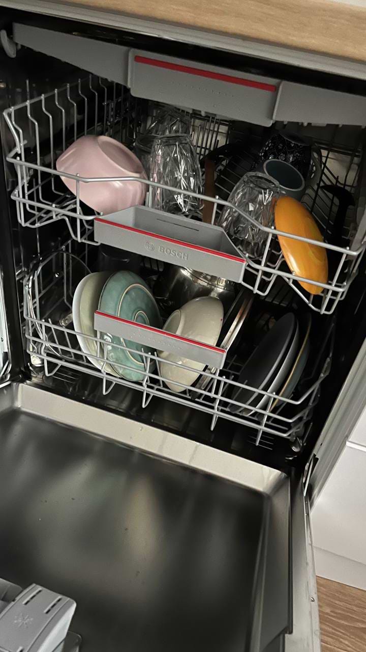 Посуд машина миє якісно — без розводів і залишків. У комплекті були капсули Finish, вони добре відмивають, але залишають сильний хімічний запах. Спробували Finish Ultimate 0% - з ними такого запаху немає, і результат миття такий самий гарний.