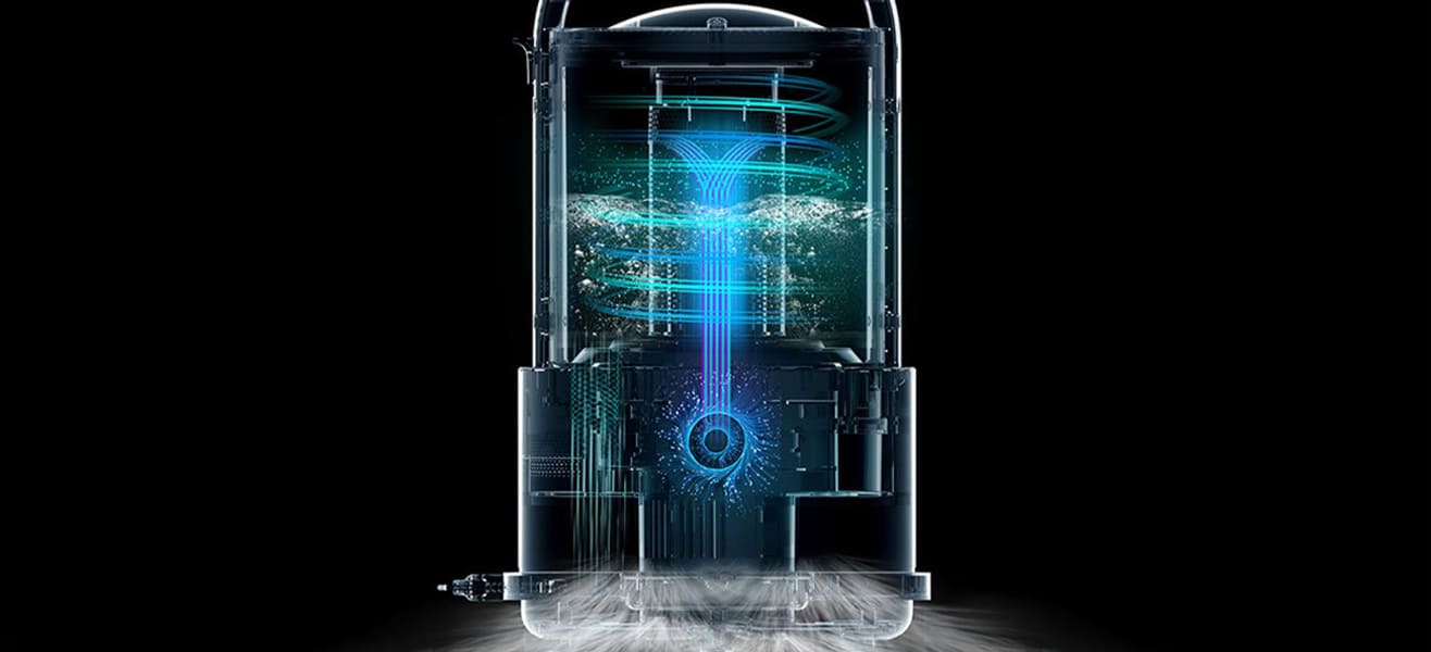 Модель оснащена чотириступеневою системою очищення повітря, яка включає НЕРА-фільтр та спеціальну відцентрову технологію. Це дозволяє ефективно затримувати пил та запобігає його повторному потраплянню в повітря. Унікальна технологія фільтрації включає:
