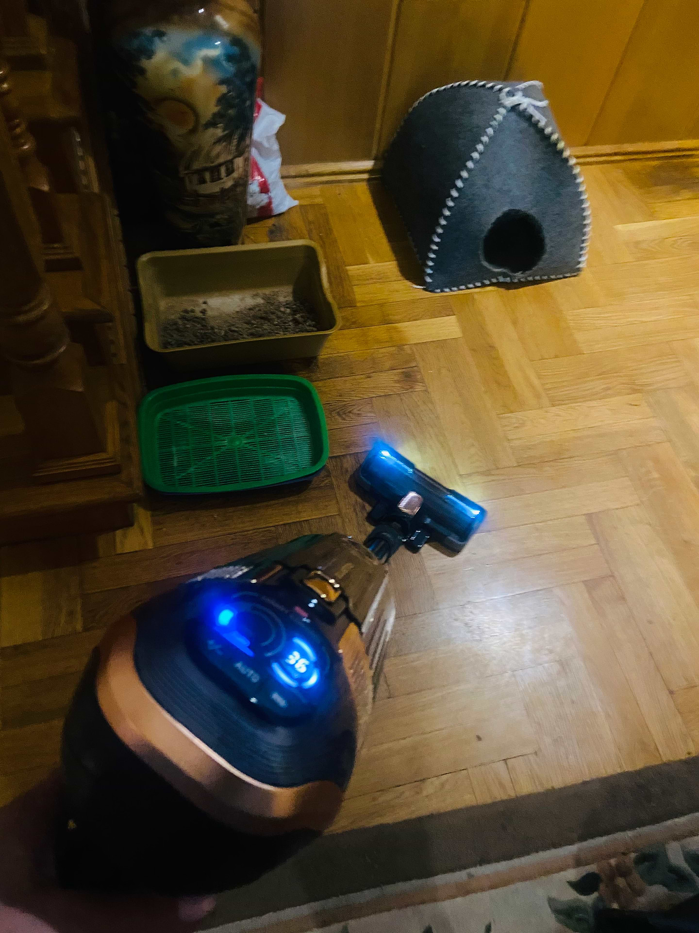 Дуже задоволена цим пилососом.Маю 3 котикаіприватний будинок з ковдрами.Пилосос працює дуже довго,сам змінює інтенсівність в залежності від поверхні.Чудово вправляється з кошачим ворсом. За підсвітку окремо дякую!Дуже зручно користуватись пилососом акамуляторним коли часті відключення енергіі. Щиро дякую продавцюВіталію за рекомендовану модель і професійну розповідь про всі моделі, я отримала пилосос з мощністю230Вт, з підсвіткою,вологимприбиранням,та підставкою- всі моі побажання були виконані .