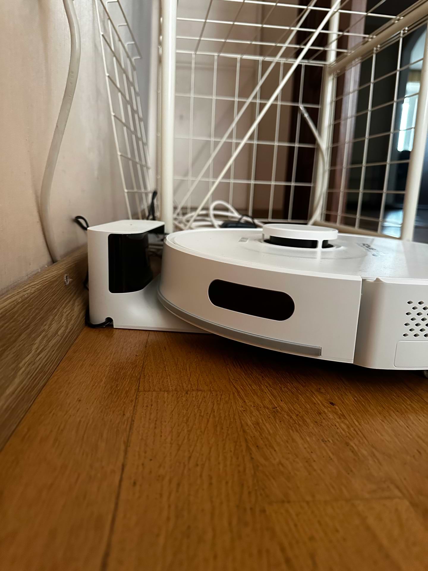 Стукається немов у депресії в дзеркало шафи-купе, фікситься віртуальною стіною, але все ж; віртуальні стіни треба ставити трішки з запасом, бо він їх трохи пересікає; час від часу проводи засмоктує, іноді бачить що це провід та уникає; він може проїхати будь який пепехід між квартирами(дійсно високі) але при цьому не може інколи з станції сам зїхати(на фото видно висоту)