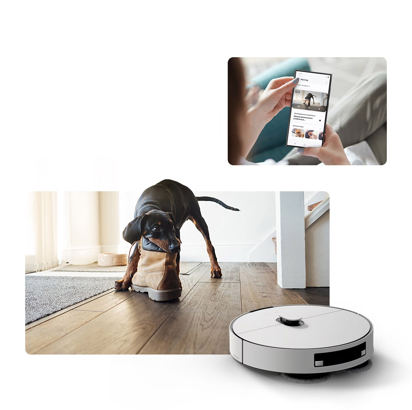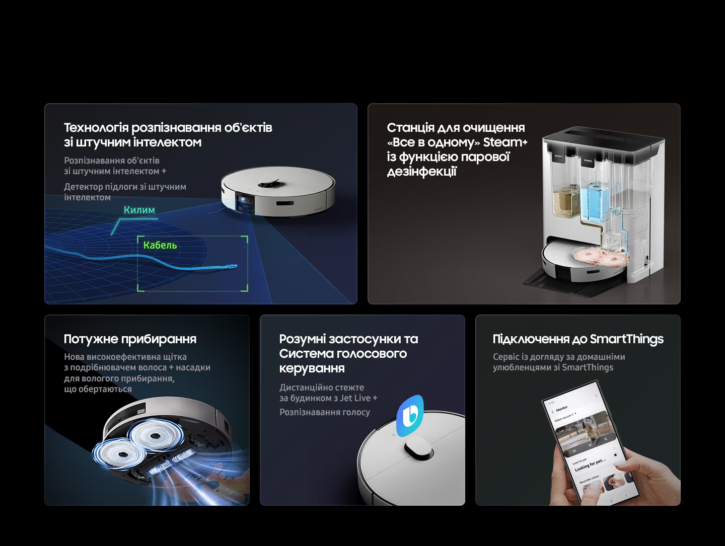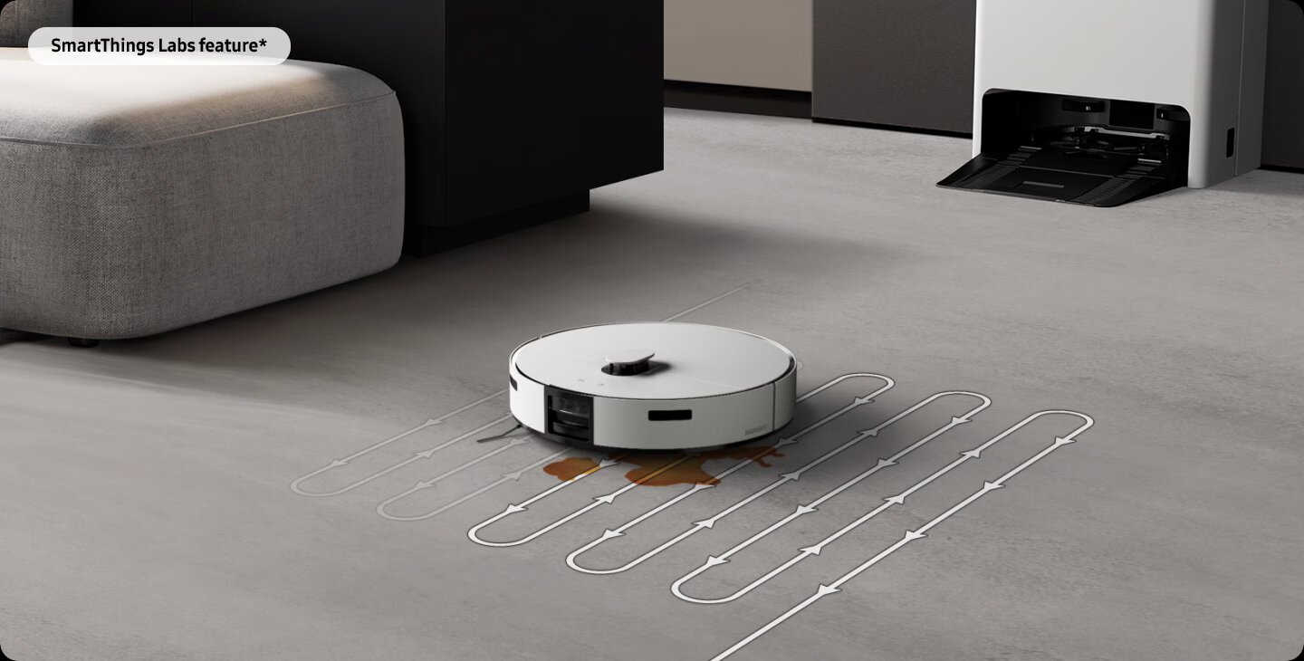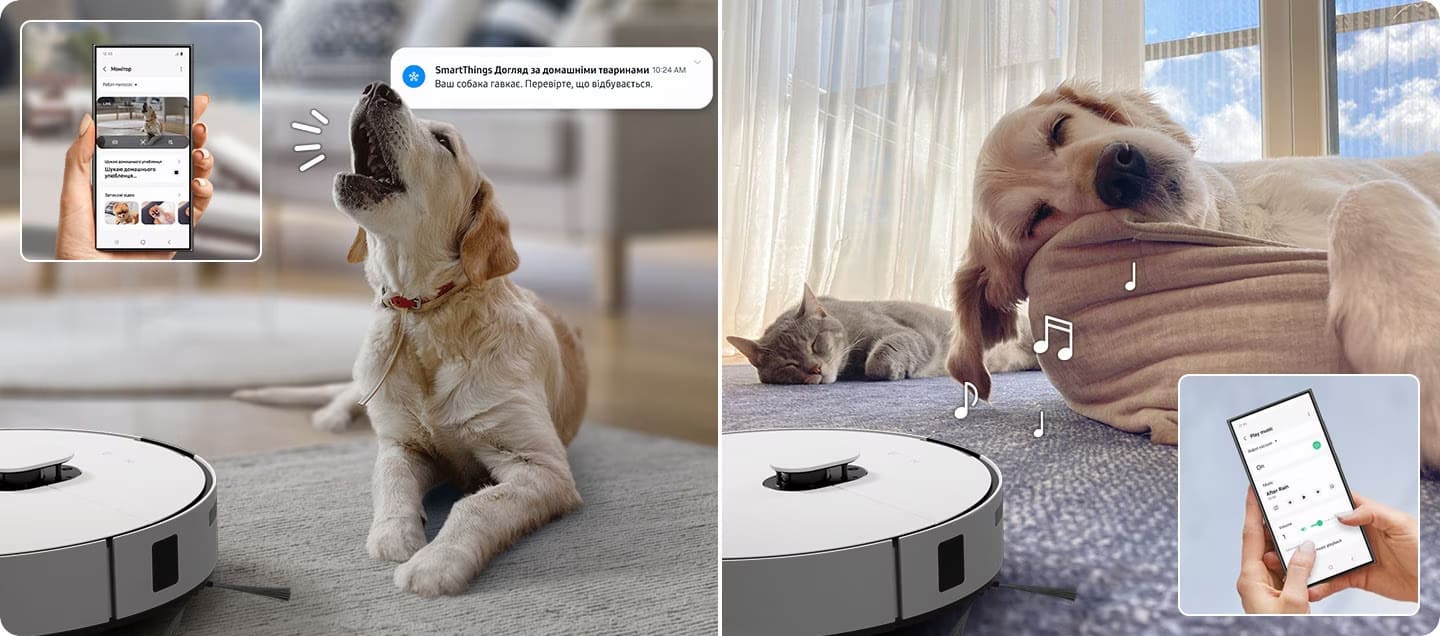 SmartThings Pet CarePet Care — це спеціальна опція у додатку SmartThings, завдяки якій ви зможете стежити за вашими тваринами та змінами у їхній поведінці з режимом відстеження у Jet Bot Combo AI. Розумний робот-пилосос обов'язково сповістить вас про гавкіт чи сумне нявкання, а ви зможете підключитися до іншого розумного пристрою, який увімкне музику або відео, щоб тварина не почувалася самотньою.