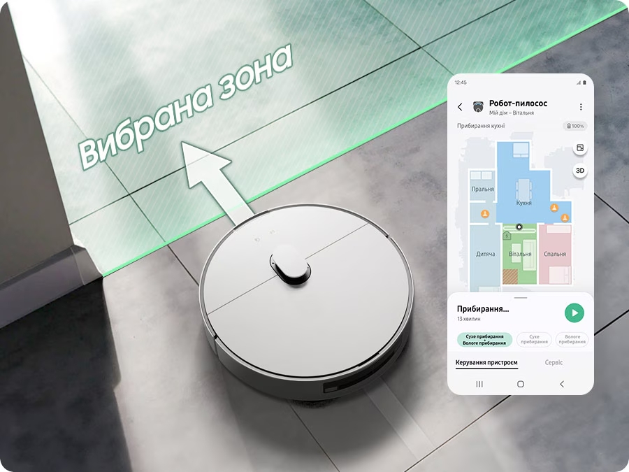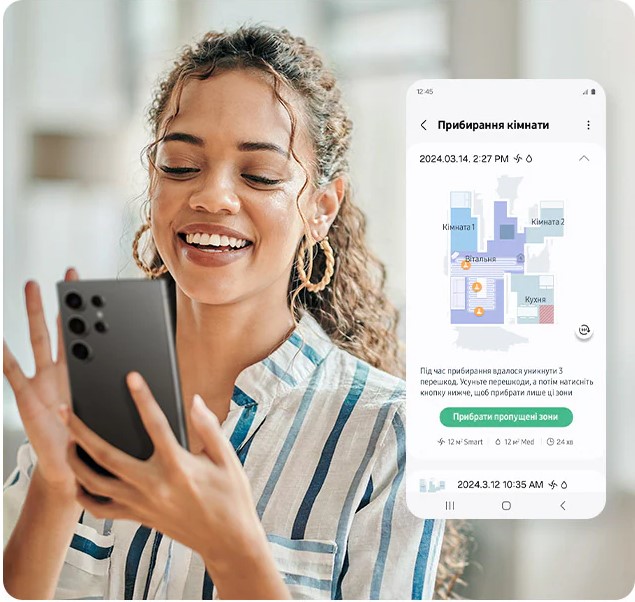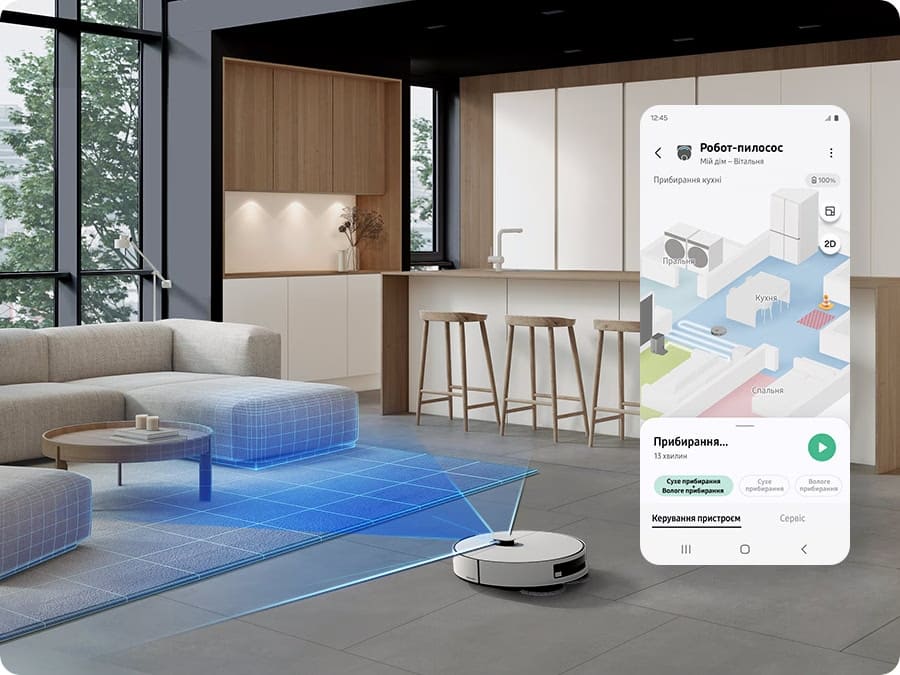 Історія прибирання у реальному часіКонтролювати роботу, стежити за рухом і станом Jet Bot Combo у режимі реального часу, закінчувати або ставити на паузу прибирання, подивитись історію прибирання, а також отримувати інформацію про збої — все це можна робити у додатку SmartThings.