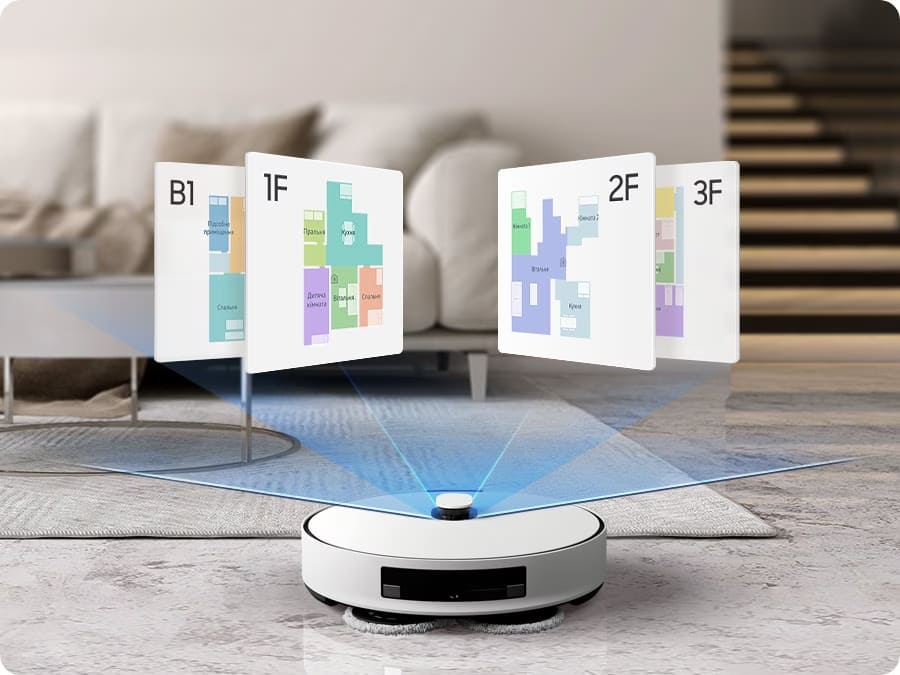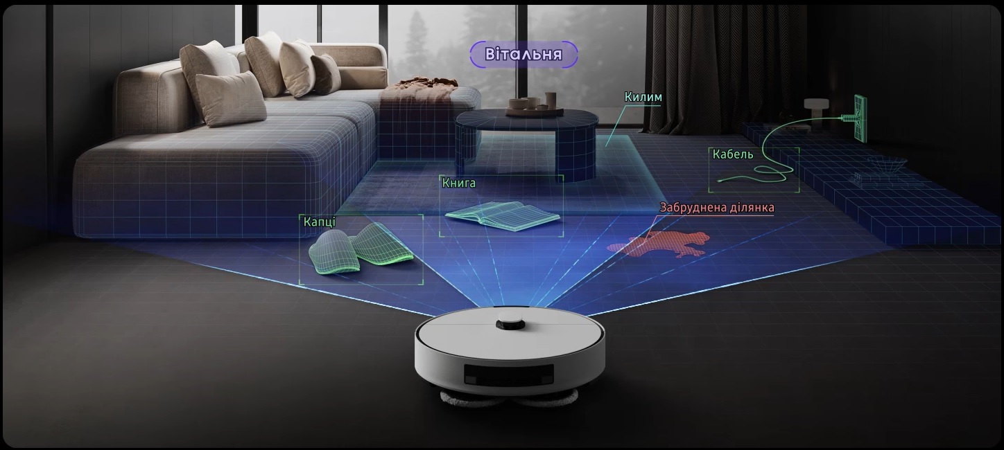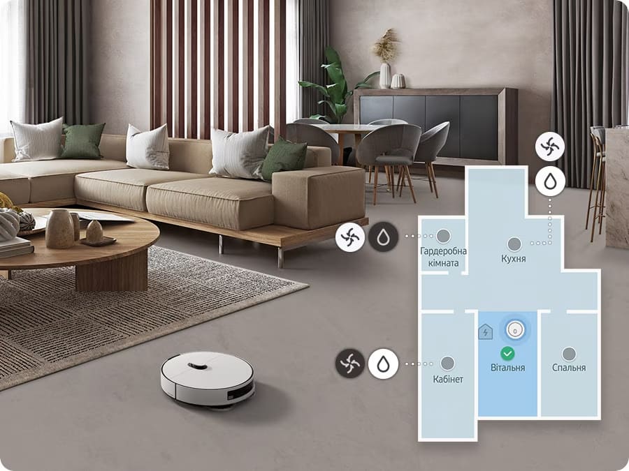 Ідентифікація кімнатРозумне виявлення об'єктів та технологія визначення предметів на площині дає можливість пилососу правильно сканувати меблі та інші пристрої, а також самостійно сформувати карту планування та додати назви всіх зон.