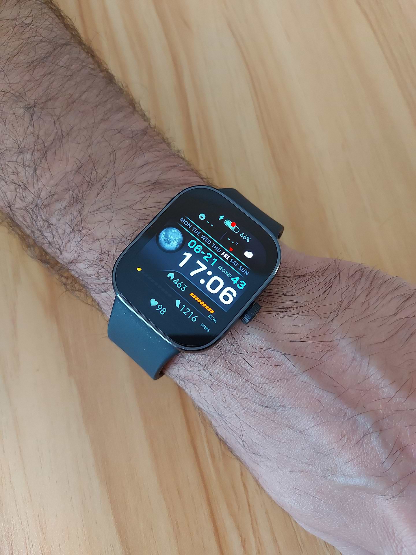 Купив я цей годинник близько місяця тому назад і в цілому задоволений. Зручне меню яке можна налаштувати в додатку, велика кількість циферблатів(деякі з них можна кастомити, підбирати їм колір), є багато шаблонів для своїх циферблатів зі своїми фото та навіть слайдшоу. Плавний великий екран з автояскравістю. Погода яка оновлюється без gps(інколи збивається). Ремінець не давить навіть якщо повністю затягти. Тренування і швидкість вимірює нормально
