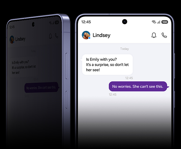 Відкрийте для себе екран, який дбає про вашу приватність - ексклюзив Galaxy S26 Ultra. Просто увімкніть вручну, і Privacy Display використовуватиме інноваційні технології для захисту вашої конфіденційної інформації шляхом приховування всього екрана від сторонніх очей. Або ж ви можете вибрати, що хочете приховати, наприклад, певні програми, усі вхідні повідомлення чи PIN-коди та паролі, коли вводите їх в налаштуваннях, на екрані блокування чи в захищеній папці.