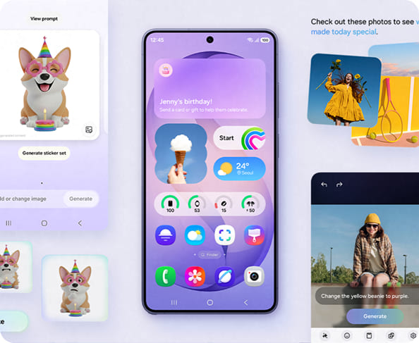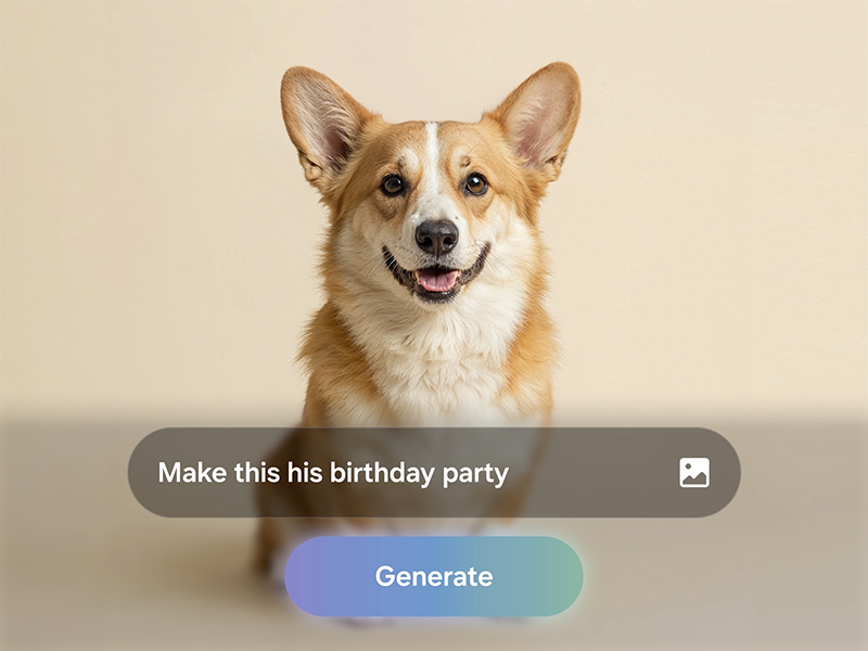 Редагуйте фото швидко й легко, використовуючи лише кілька слів та AI. Додавайте на фото свого улюбленця аксесуари та інші елементи, просто описавши бажані зміни, і Galaxy AI реалізує ваш задум за лічені хвилини.
