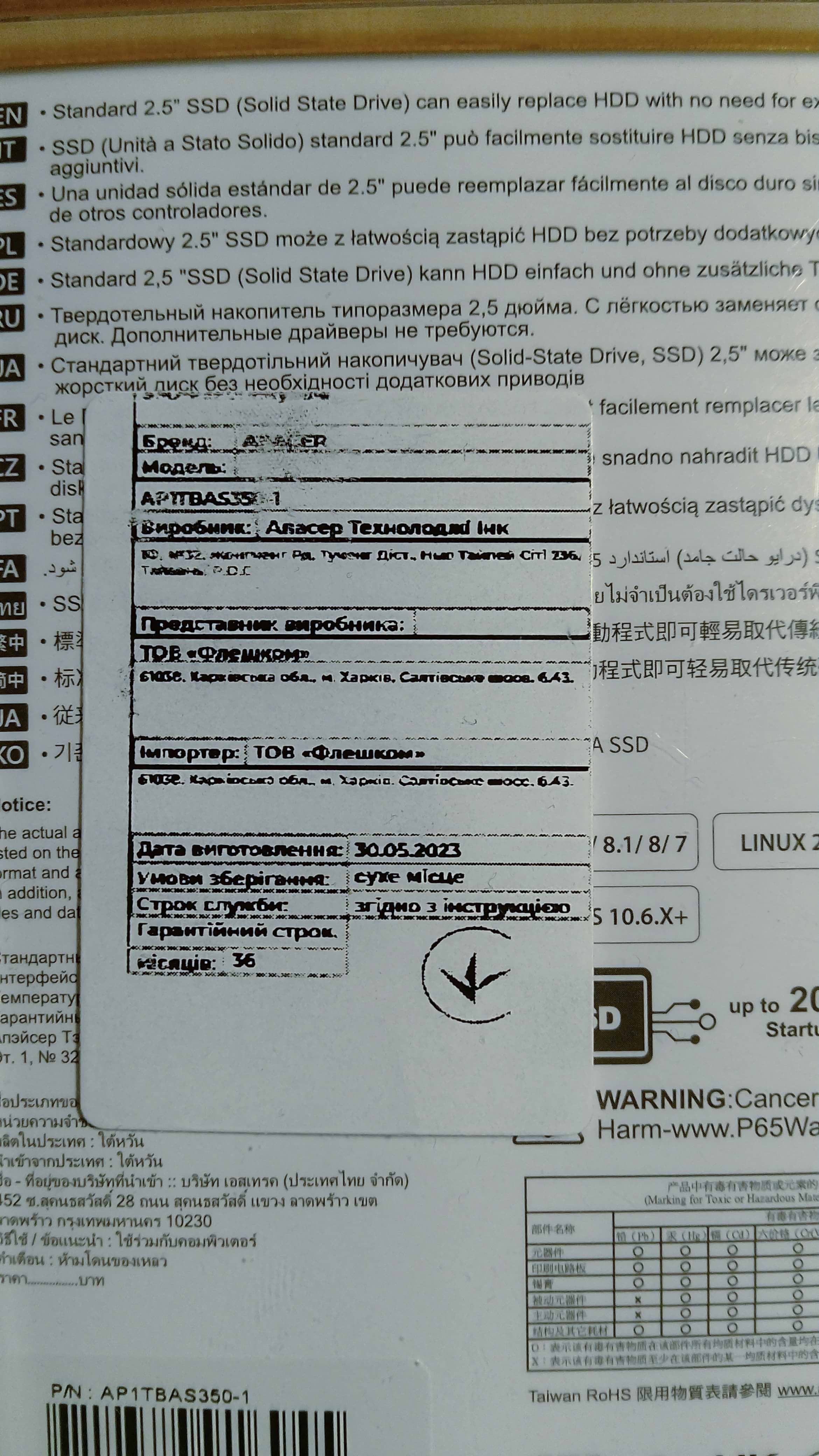 SSD-накопичувач внутрішній Apacer 2.5'' 1TB (AP1TBAS350-1)